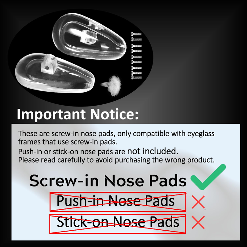 Not compatible with: Push-in (snap-in) nose pad frames (which use a small peg that snaps into a socket). Stick-on / adhesive nose pads (which have no screw or bracket).