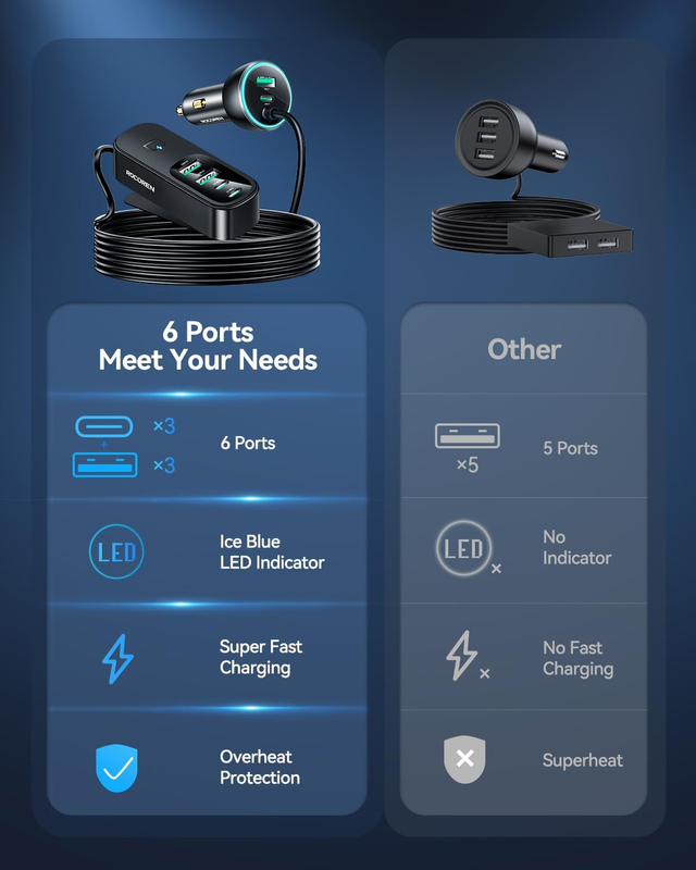 105W 6-Ports Family Travel Charging: This car charger usb c has 3*USB-C ports and 3*USB-A ports, 2 ports (35W USB-C + 30W USB-A) for driver seat and 4 ports (35W USB-C*2 + 30W USB-A*2) for rear seat passengers, is designed for family and multiple people charging simultaneously. 5 FT extension cable and the back clip can help you hang or secure the car charger in the back seat pockets.The multi port charger adapter is good choice for cars, SUVs, trucks, and all 12V~24V vehicles. Best gifts for your trip. Good choice for christmas gifts, not only can it gifts for men, but it can also be gifts for women. A great gift for father on Fathers Day