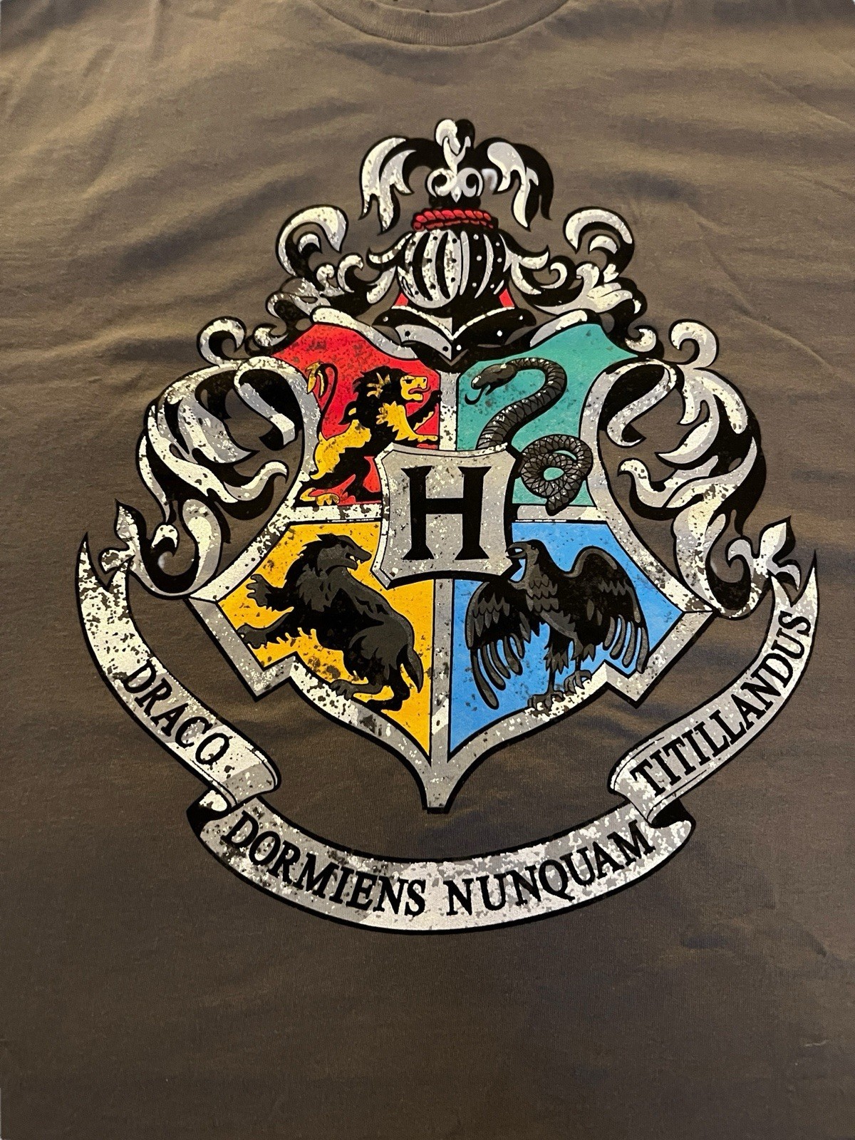 Show your Hogwarts pride with this officially licensed Harry Potter Hogwarts Crest T-Shirt in size 3XL. Made from 100% cotton, this comfortable gray tee features the bold Hogwarts school crest with the four house animals ? Gryffindor lion, Hufflepuff badger, Ravenclaw eagle, and Slytherin serpent ? along with the Latin motto Draco Dormiens Nunquam Titillandus (?Never Tickle a Sleeping Dragon?). Perfect for casual wear, conventions, or gifting to a Potterhead, this unisex tee is a must-have addition to any Wizarding World fan?s wardrobe. Machine washable, soft, and ready to wear.