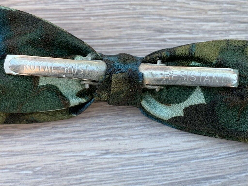 Royal vintage men's 1940's clip-on rayon bow tie blues and green flowers print. Width is 1.25". Length is 4.25" with a 2.75" metal clip marked Royal Rust Resistant. Good used condition.