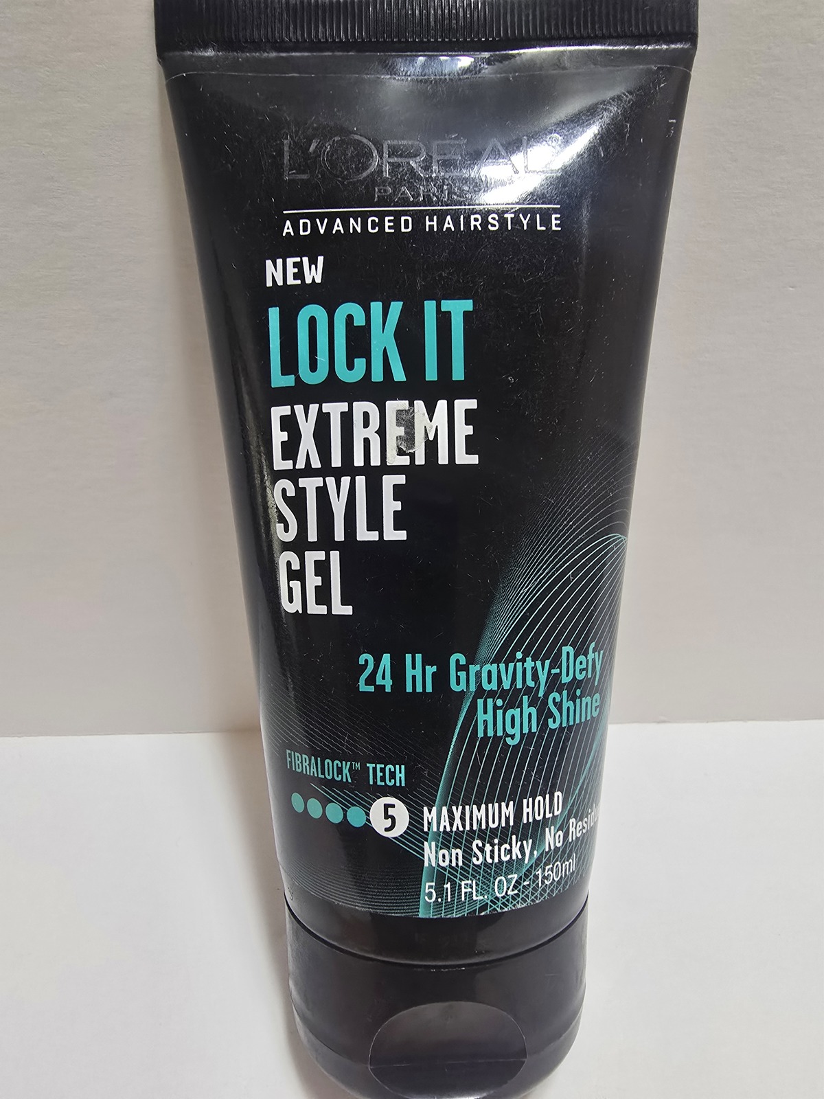 L'oreal Paris Lock It Extreme Style Hair Gel Maximum Hold High Shine 5.1 FL OZ Rare. Condition is new, unused. Tube does show some shelf wear. The loreal word on the front label is worn down, but still there. This is a discontinued, very hard to find item.