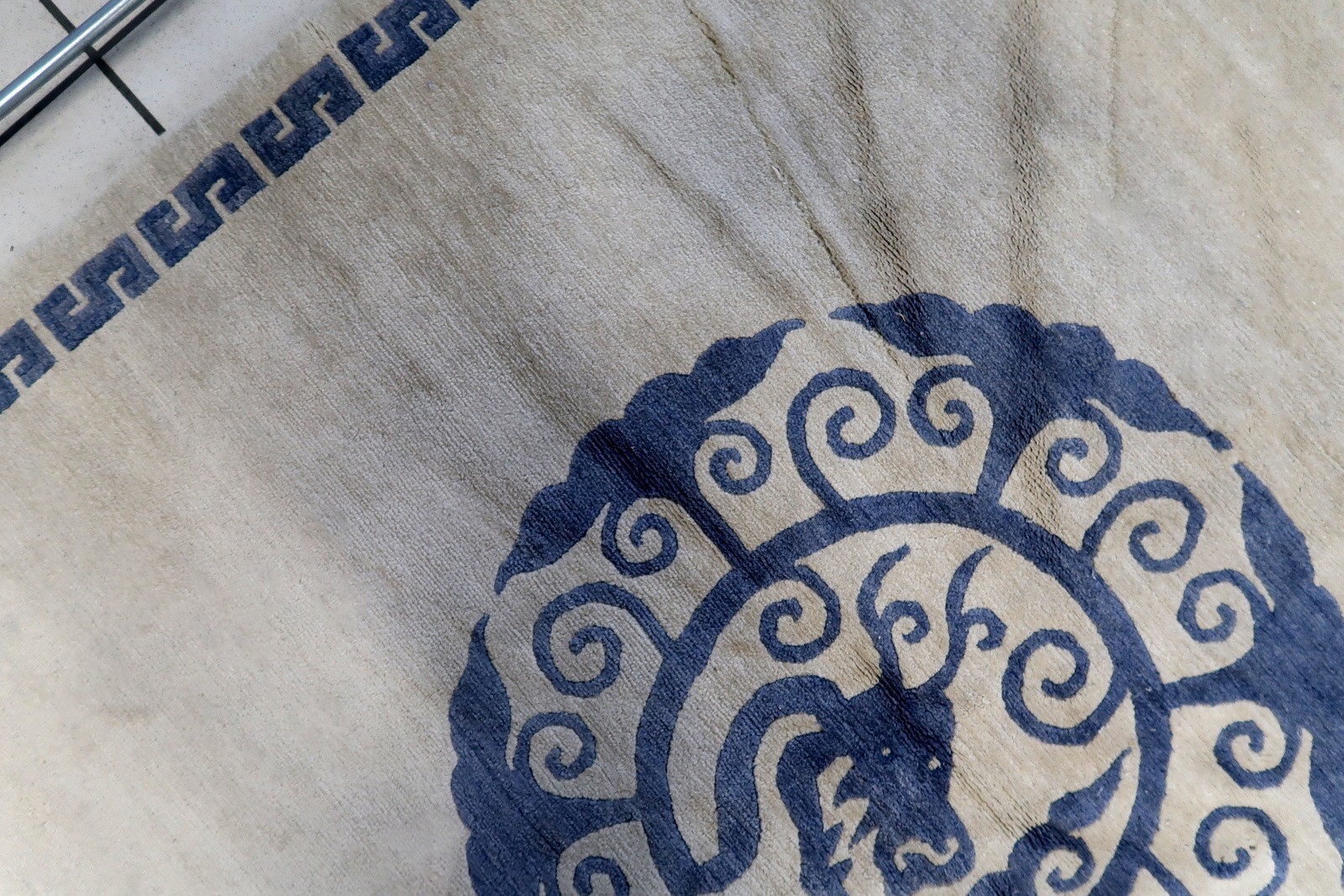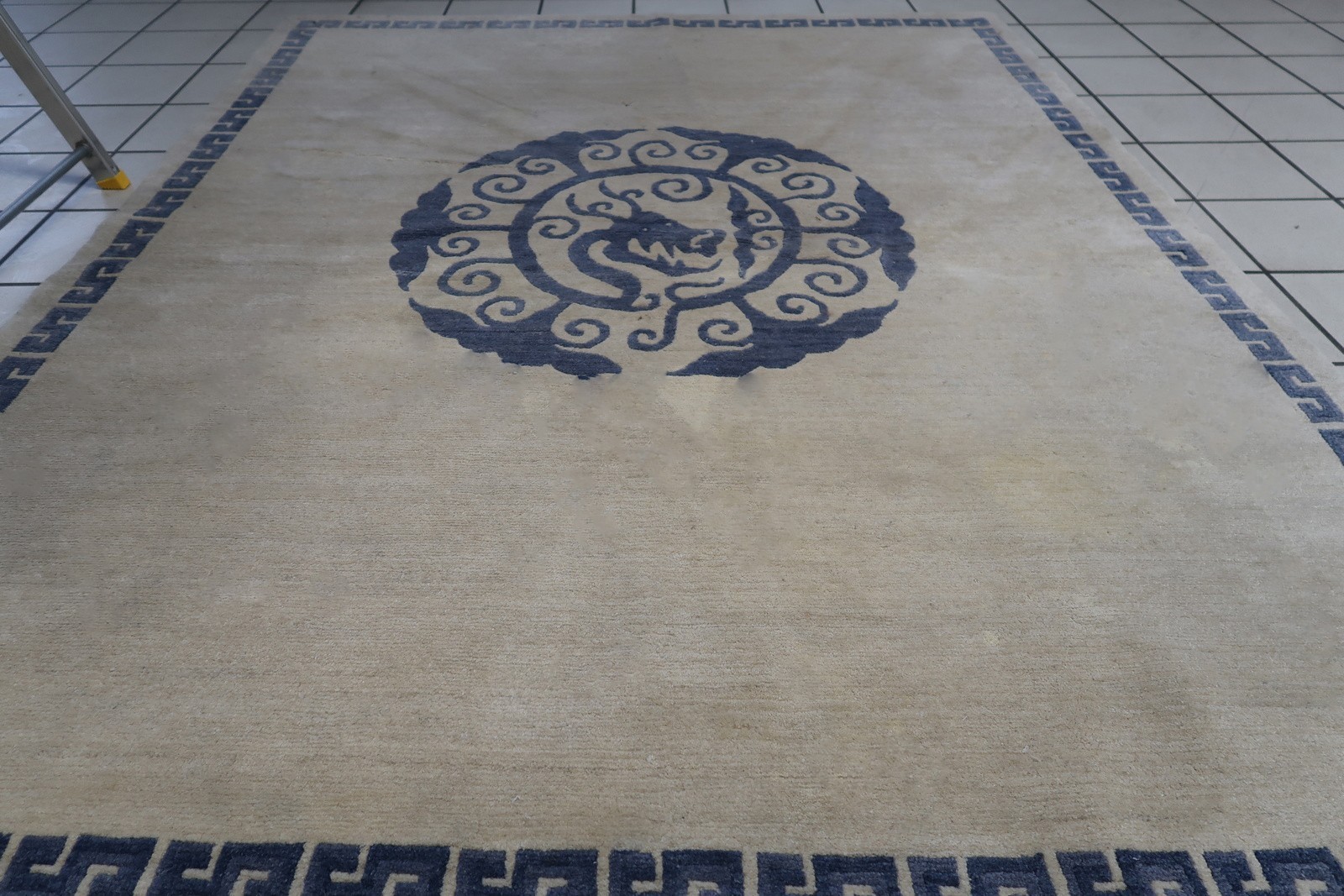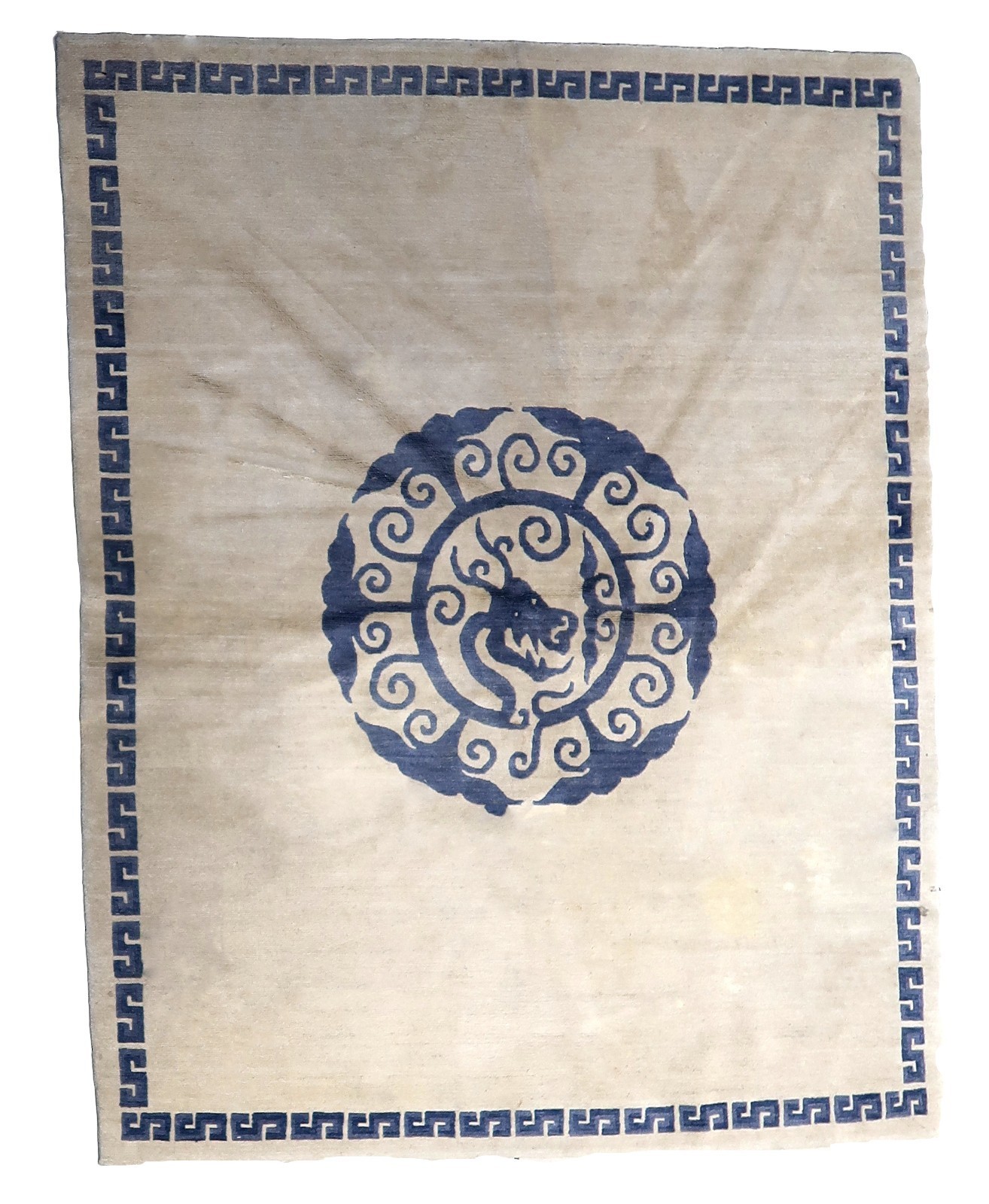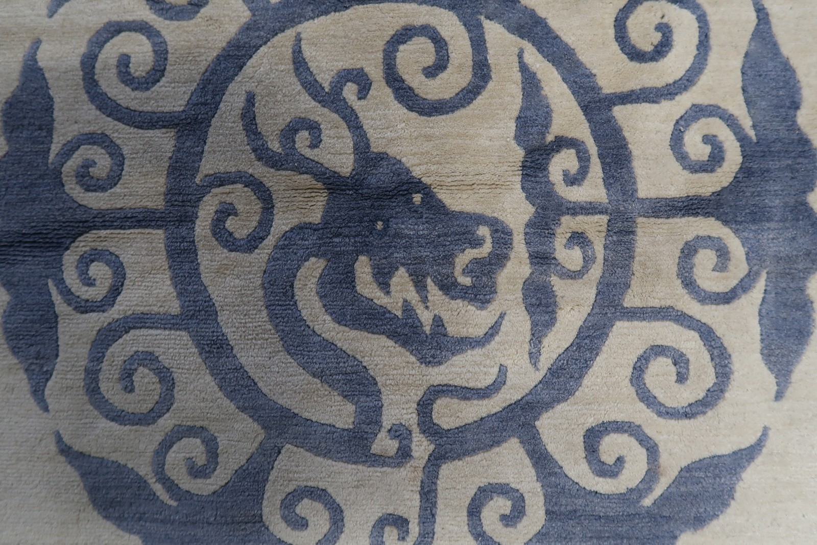Le tapis presente un design captivant, avec un medaillon circulaire imposant en son centre, orne d'un motif de dragon finement tisse. Le dragon symbolise la puissance, la sagesse et la prosperite dans la culture tibetaine.