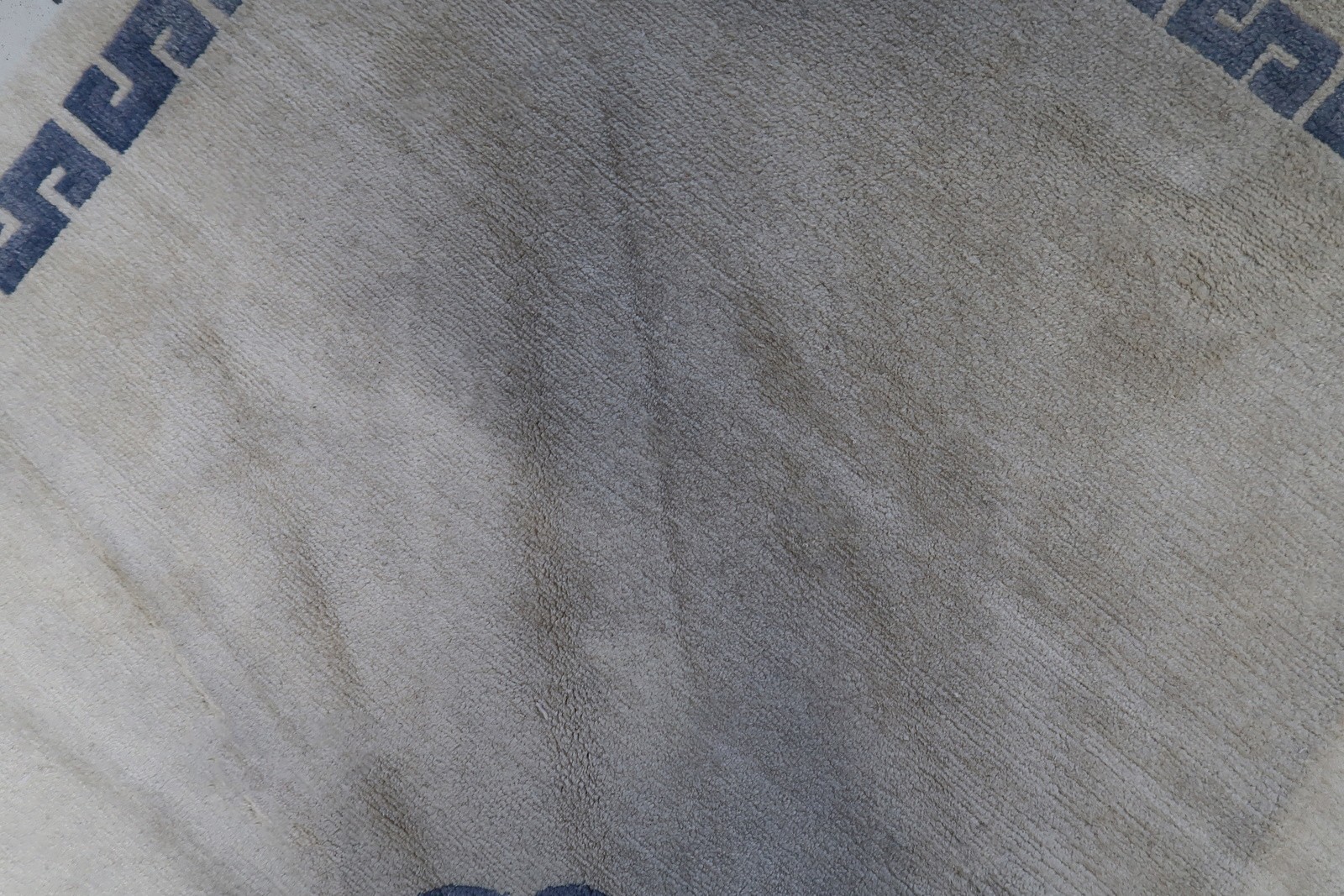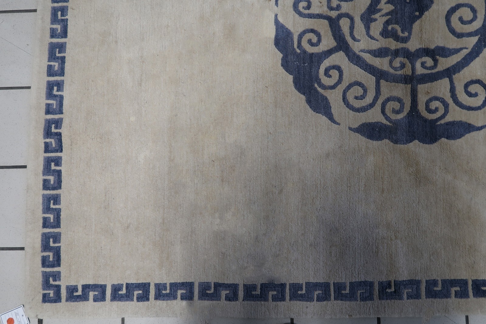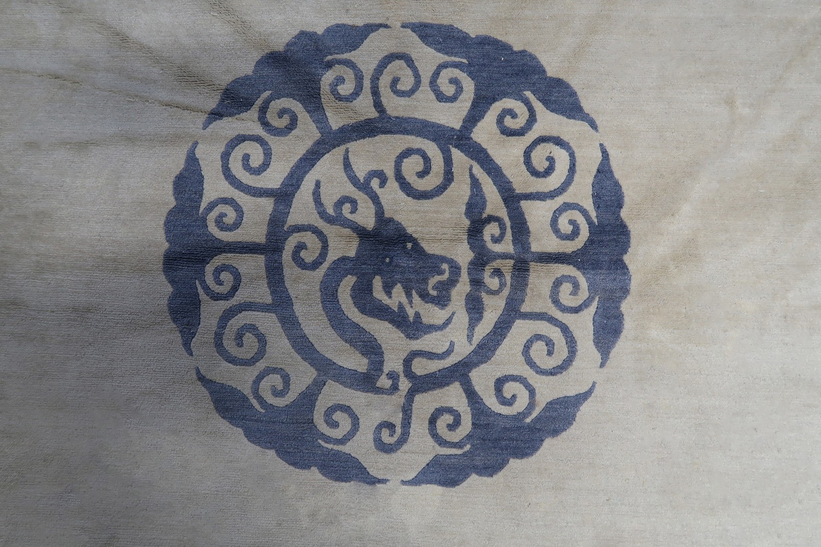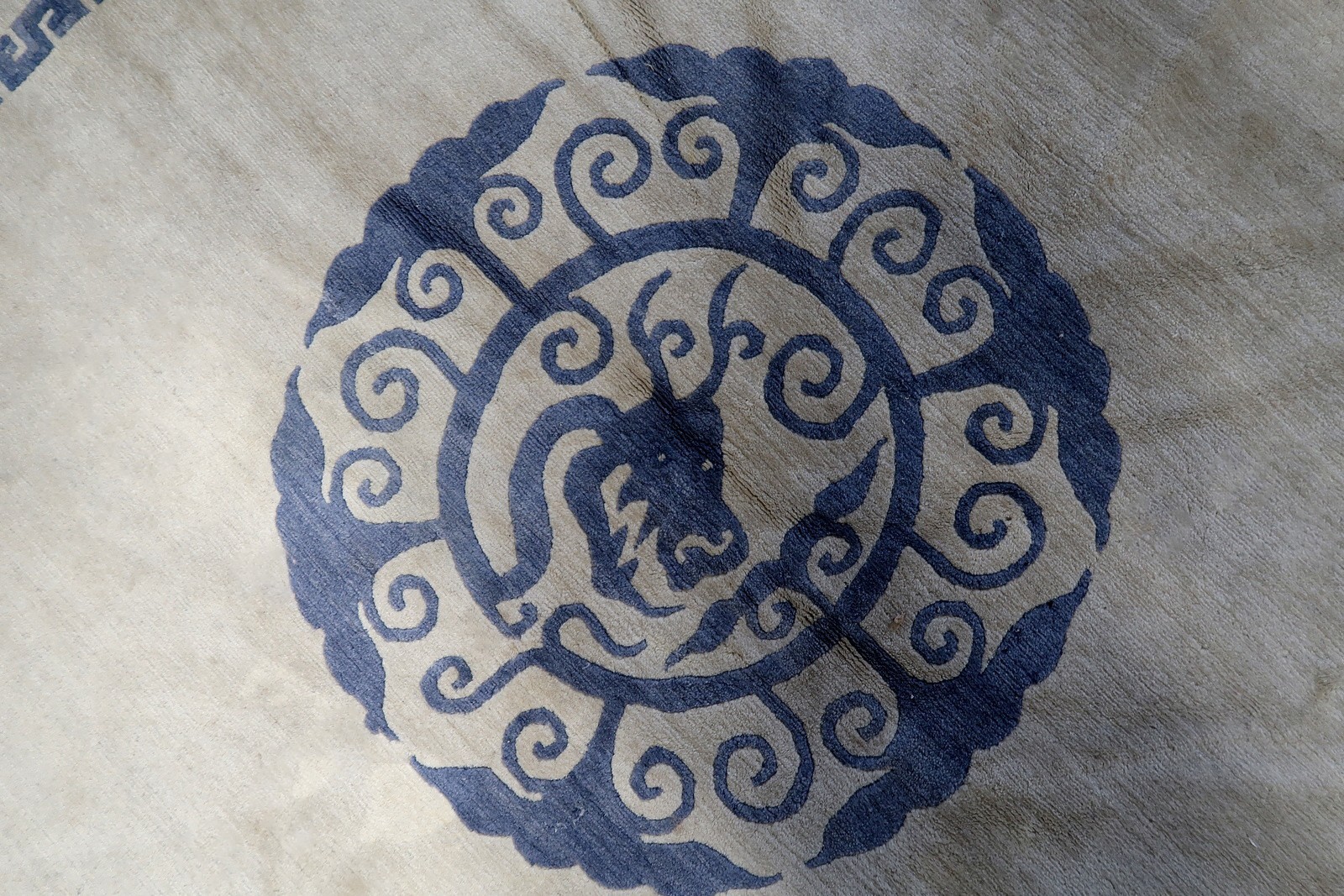 Le tapis presente un design captivant, avec un medaillon circulaire imposant en son centre, orne d'un motif de dragon finement tisse. Le dragon symbolise la puissance, la sagesse et la prosperite dans la culture tibetaine.