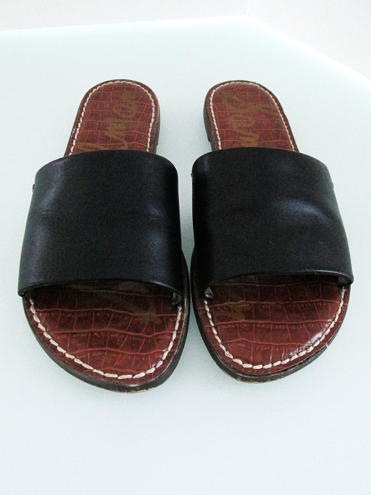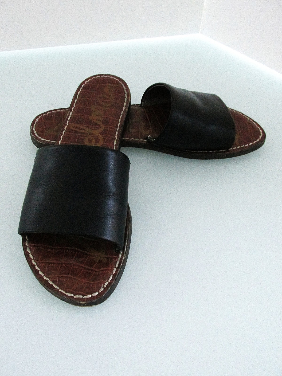 Description: Up for sale is a pair of Sam Edelman women's leather slip-on slides. These open-toe slides are US size 8 M. They are black in color with imitation brown alligator. These shoes have leather upper soles. They feature the Sam Edelman logo on the sides in silver. These pair of Sam Edelman women's slides are in very good condition and do not come with a box.