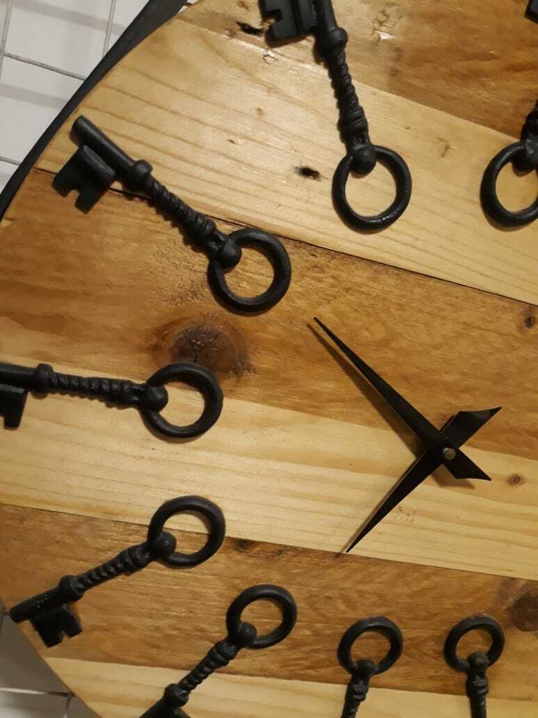 Große Artizay-Wanduhr aus recyceltem Naturholz für den Innenbereich mit gravierten Tasten aus massivem Metall. Hergestellt aus recyceltem Palettenholz und die Schlüssel sind aus Gusseisen. Eine einzigartige Uhr mit einem dekorativen Gürtel zum Aufhangen als Wanddekoration. Die Vintage-Metallschlüssel vermitteln einen Look der 60er Jahre. Artizay hat den Ruf, Außergewohnliches zu schaffen. Die Große betragt 16''x16'' Zoll. Wiegt 1,5 kg (3 Pfund). Es ist in Luftpolsterfolie, Thermocol und einem Wellpappkarton verpackt, um es vor der Handhabung durch Kuriere zu schützen. Es handelt sich um eine limitierte Auflage, das letzte seiner Art.