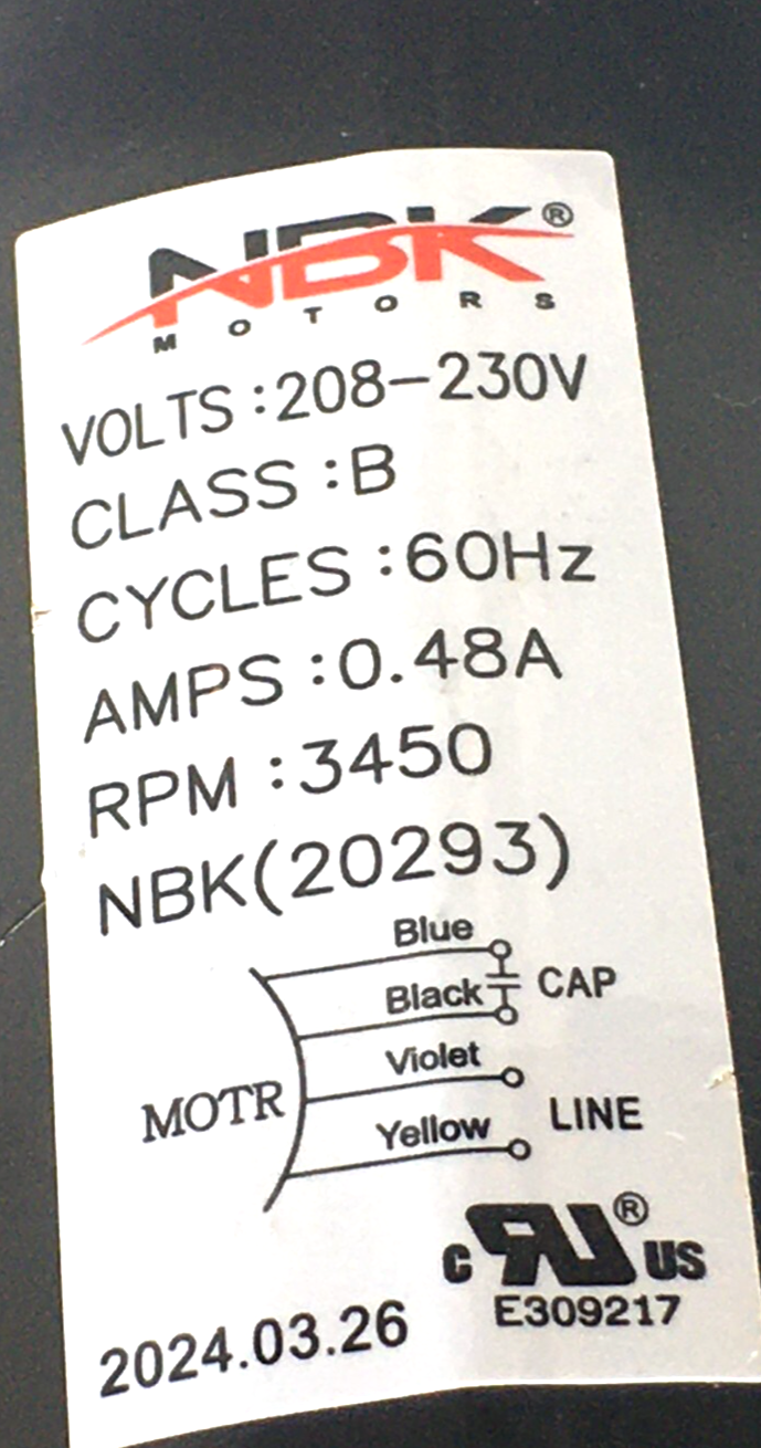 This is NBK Draft Inducer Motor Assembly NBK (20293) 208/230V 3450 RPM used part.