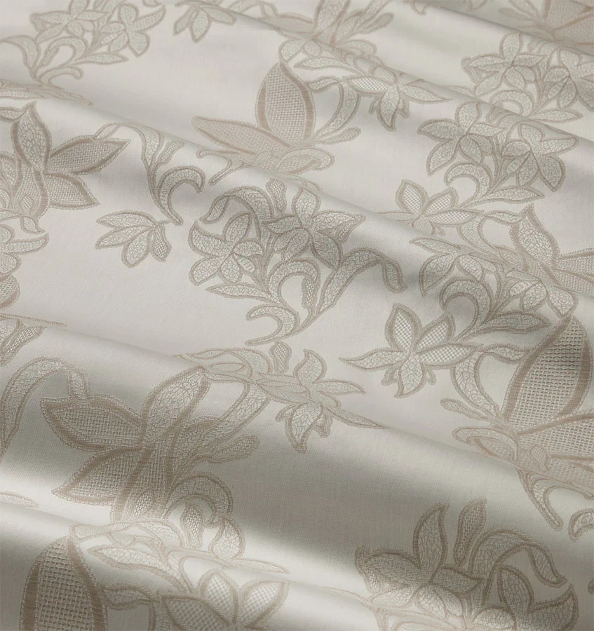 In the storied threads of Tivoli, a tale of romantic nostalgia unfolds. This exquisite Italian-made yarn-dyed sateen jacquard weaves a delicate floral design, reminiscent of the intricate texture of lace. The soft, taupe base of Tivoli gently cradles these ethereal blooms, as though they harbor secrets from bygone eras.