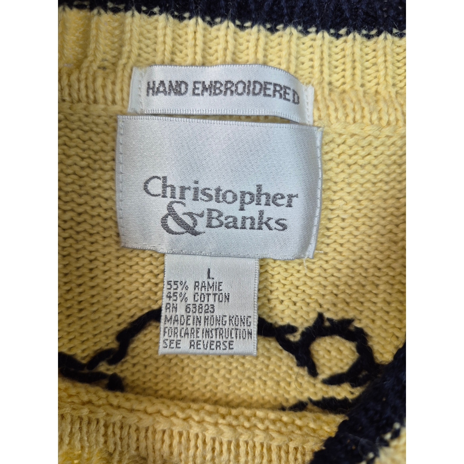Vtg Cat Lady sweater Christopher & Banks Cotton Yellow Navy Blue Heart/Cats Sz L