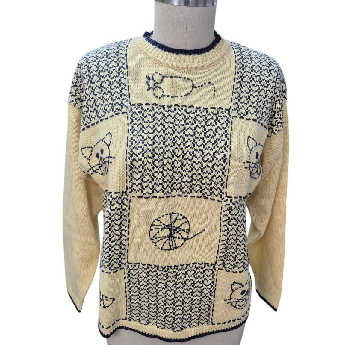 Vtg Cat Lady sweater Christopher Banks Cotton Yellow Navy Blue Heart/Cats Sz L with shoulder pads, in very good condition.