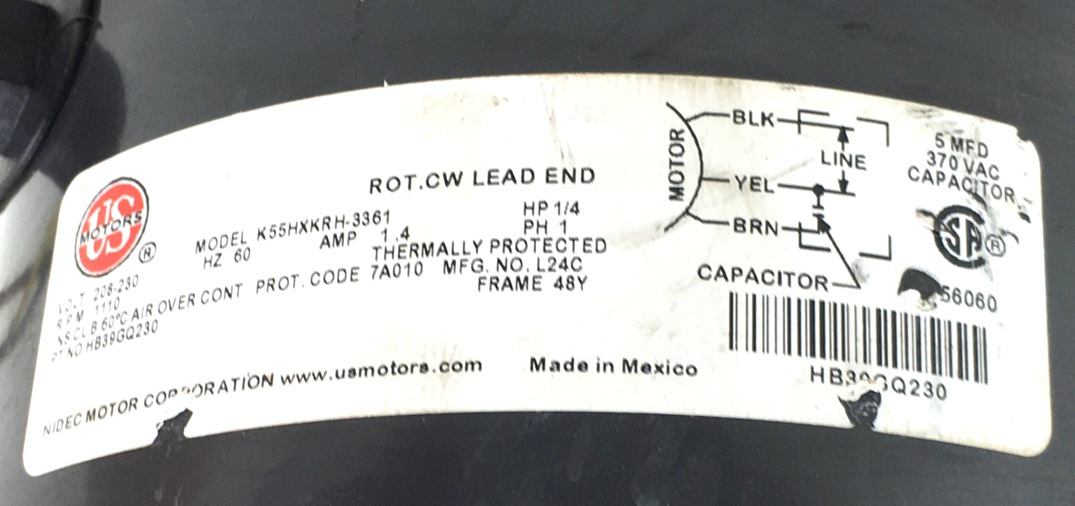 This is US Motors K55HXKRH-3361 Condenser Motor Carrier HB39GQ230 1/4HP 208/230V 1110 RPM used part.