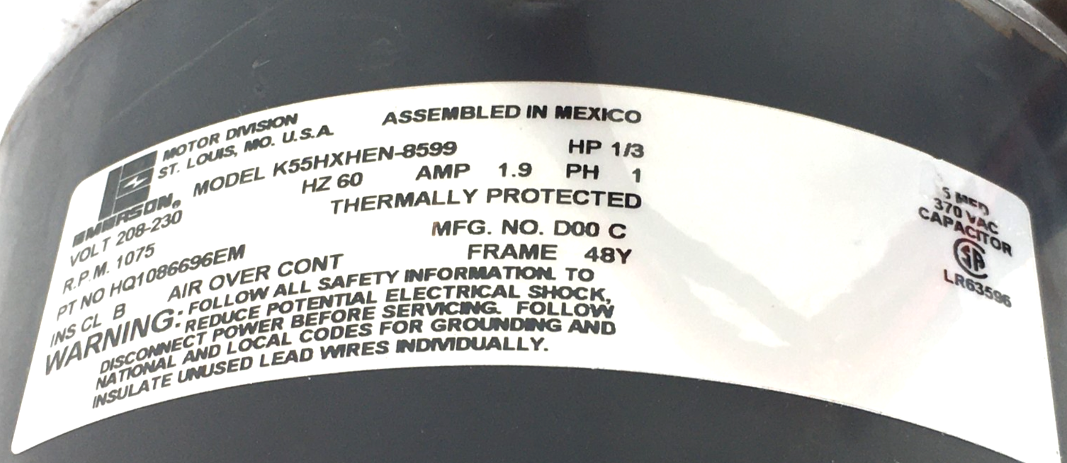 Emerson K55HXHEN-8599 Condenser Motor HQ1086696EM 1/3HP 208/230V used #ME484