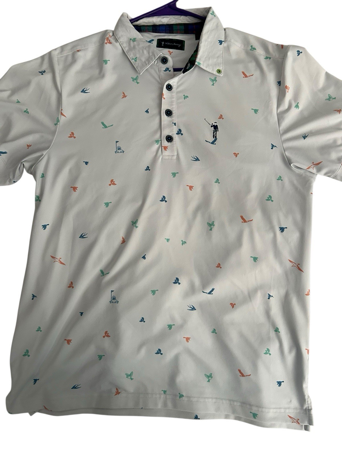 The William Murray Shirt for men in size Medium is a polo shirt designed for golf performance. Made from a blend of polyester and spandex, this short sleeve shirt features a collared neckline with a button closure, making it perfect for activewear or casual occasions. The shirt has a geometric pattern and logo accents, with stretch and moisture-wicking features for added comfort and functionality. Ideal for summer and spring seasons, this regular fit polo from William Murray is machine washable and a great choice for sports enthusiasts.