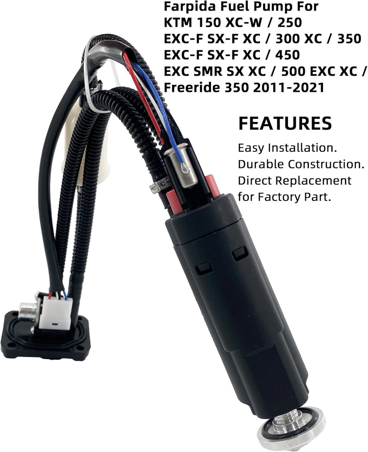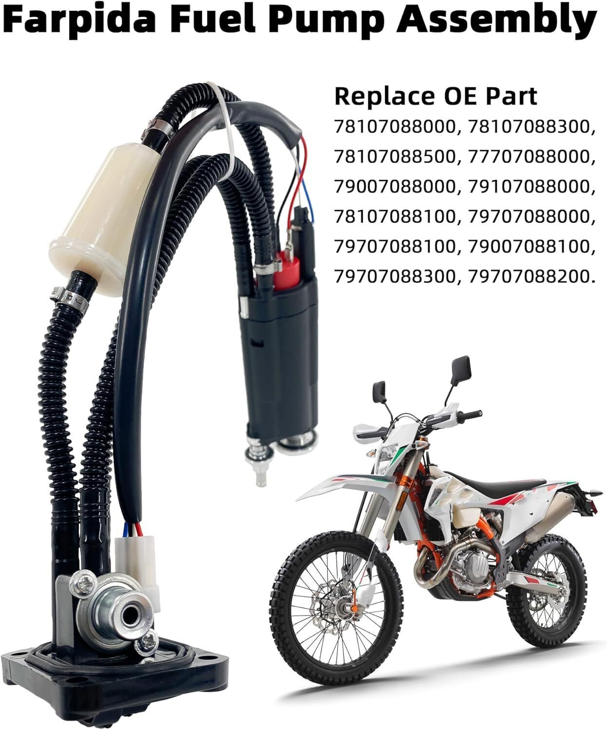 ?High Quality?Fuel pump components are manufactured and tested to the same exacting quality standards as our OE fuel pumps to ensure long, reliable service life. ?Replaces Part?78107088000, 78107088500, 77707088000, 79007088000, 79107088000, 78107088100, 79707088000, 79707088100, 78107088300, 79007088100, 79707088300, 79707088200. ?Note?Please check the part number/ make / model / year carefully before purchasing to insure fitment. Any question, feel free to contact us. ?Compatible Vehicle ?78107088000 78107088300 Fuel Pump Assembly For KTM 150 XC-W / 250 EXC-F SX-F XC / 300 XC / 350 EXC-F SX-F XC / 450 EXC SMR SX XC / 500 EXC XC / Freeride 350 2011-2021. ?Quick and easy plug-in installation? Replace all wear parts at once with our comprehensive installation kit. ?Warranty?Farpida's fuel pump assembly module comes with a 1-year warranty. If your fuel pump fails, please contact us immediately to resolve the problem for you.