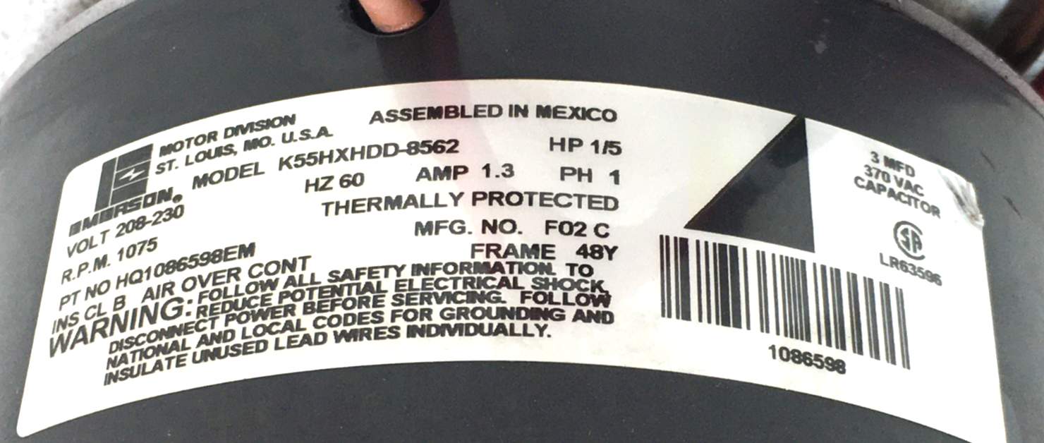 This is Emerson K55HXHDD-8562 Condenser Motor HQ1086598EM 230V 1/5HP 1075RPM used part.