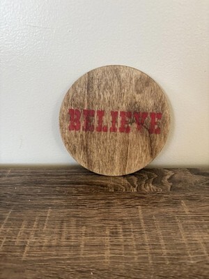 This beautifully crafted wooden plaque from Savvy Creations features the word "BELIEVE" in bold red letters, perfect for adding a rustic and inspirational touch to your seasonal decor.