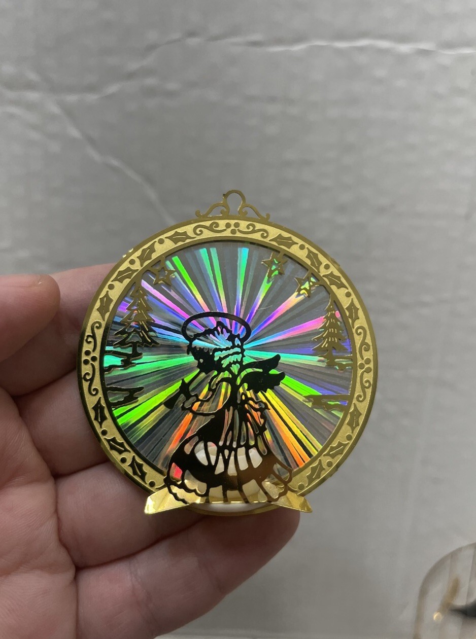 This set of 5 gold tone holographic Christmas 3" ornaments features 3D laser cut designs of angels and wreaths etc. These ornaments are perfect for holiday decor, adding a touch of elegance to your Christmas tree. The holographic effect creates a festive and magical ambiance, making them a charming addition to your seasonal decorations. Very good condition! Please let me know if you have any questions!