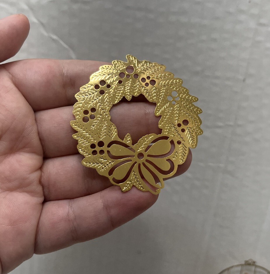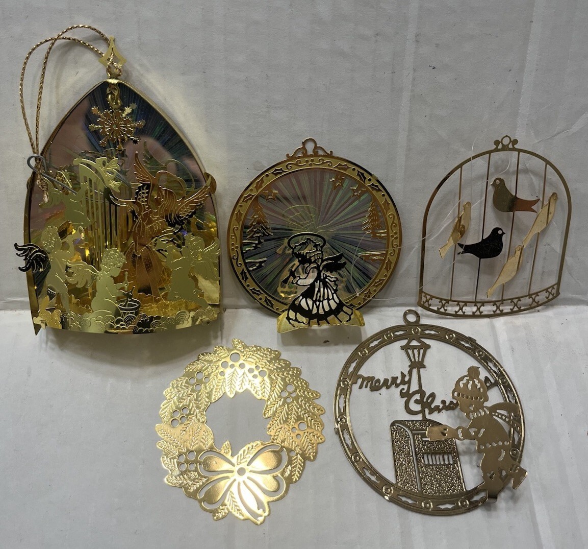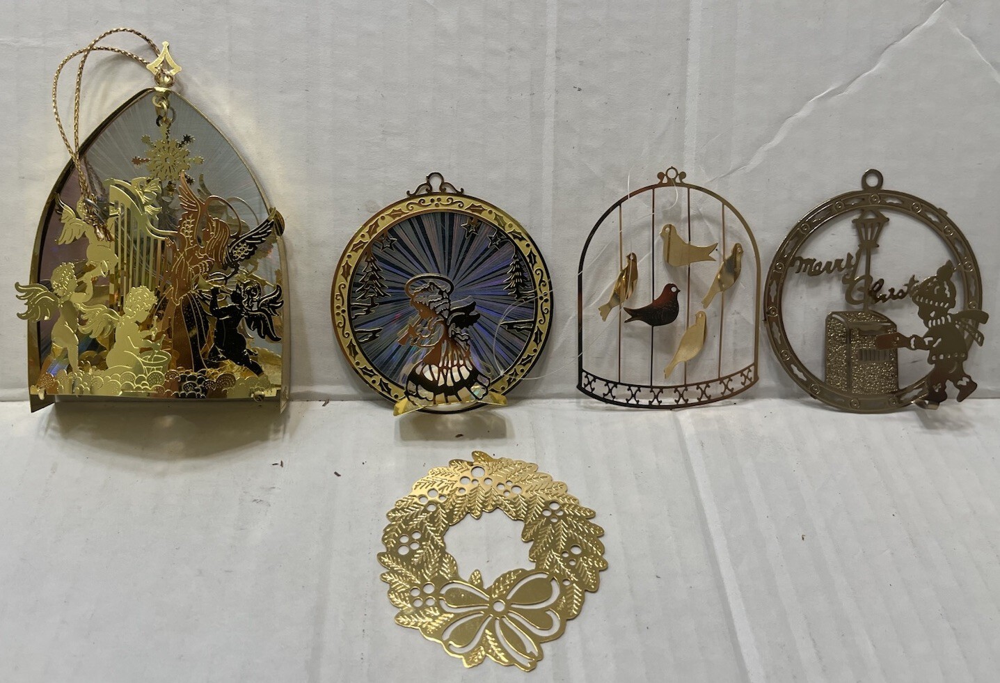 Holographic Christmas Ornaments Gold Tone 3D Laser Cut Set Of 5-wreath, angels