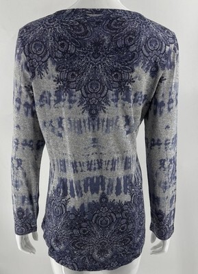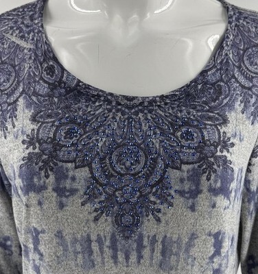 One World Tunic Sweater Sz Large Blue Paisley Rhinestone Lightweight Boho Artsy