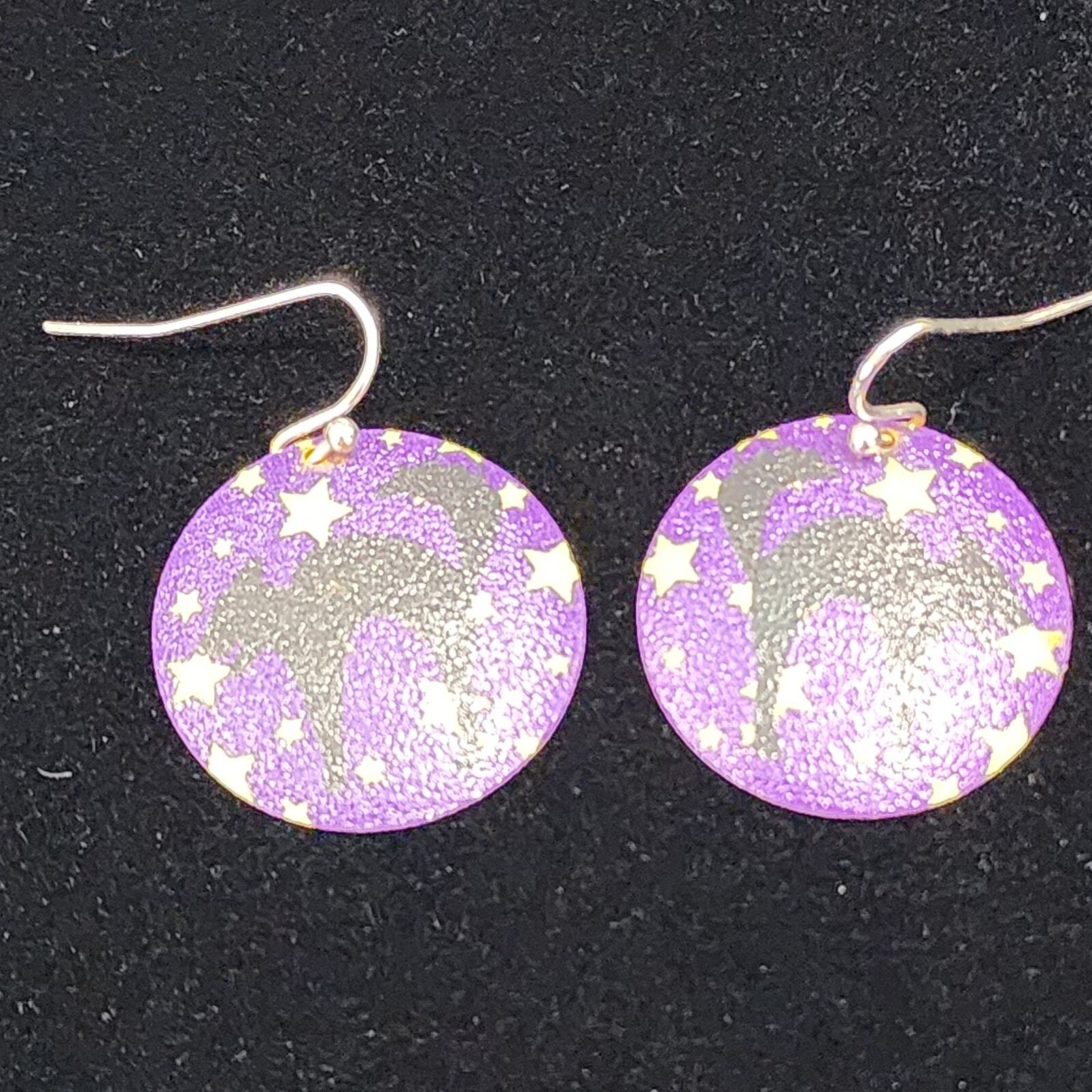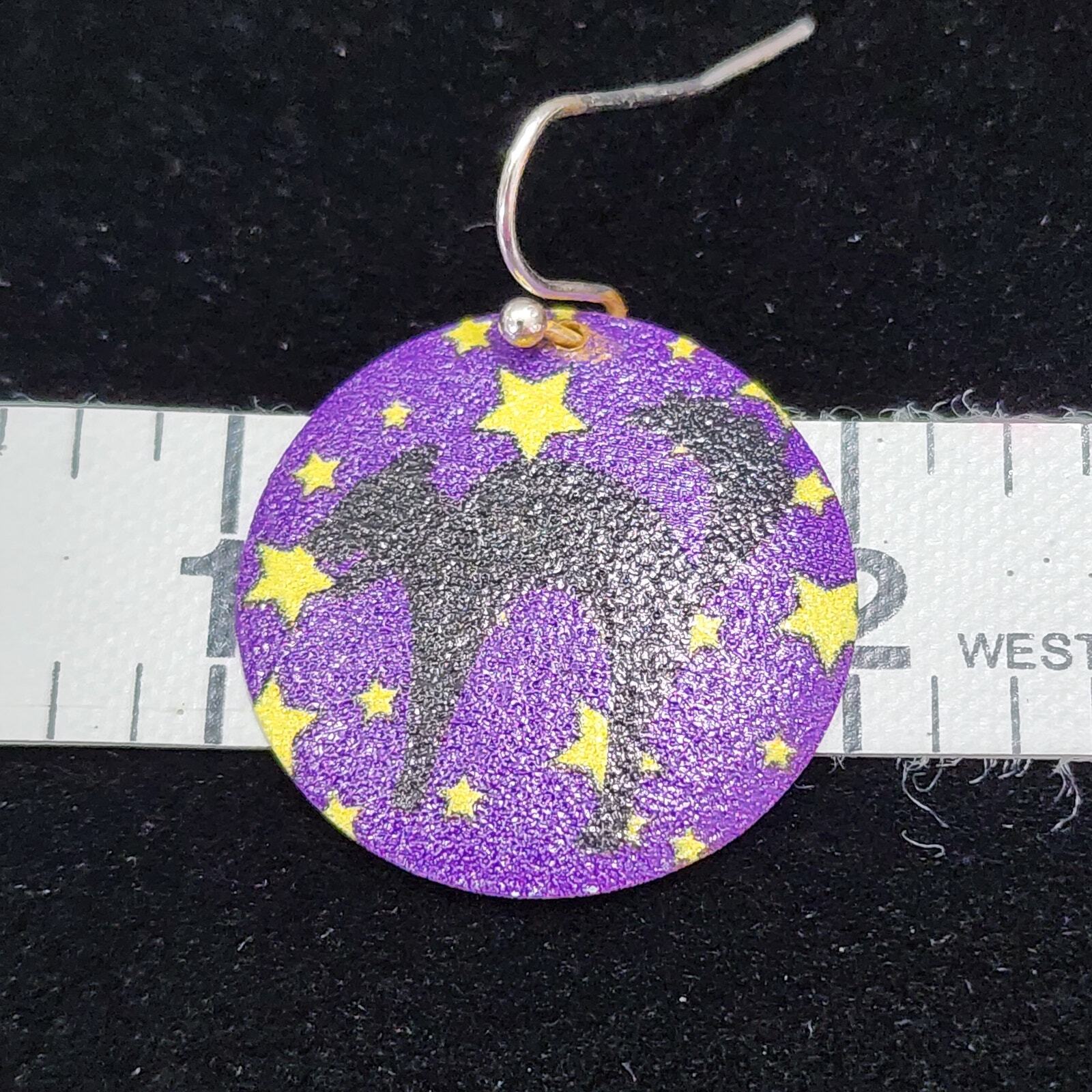 Halloween Black Cat Silhouette Gold Stars On Purple Round Disc Dangle Earrings