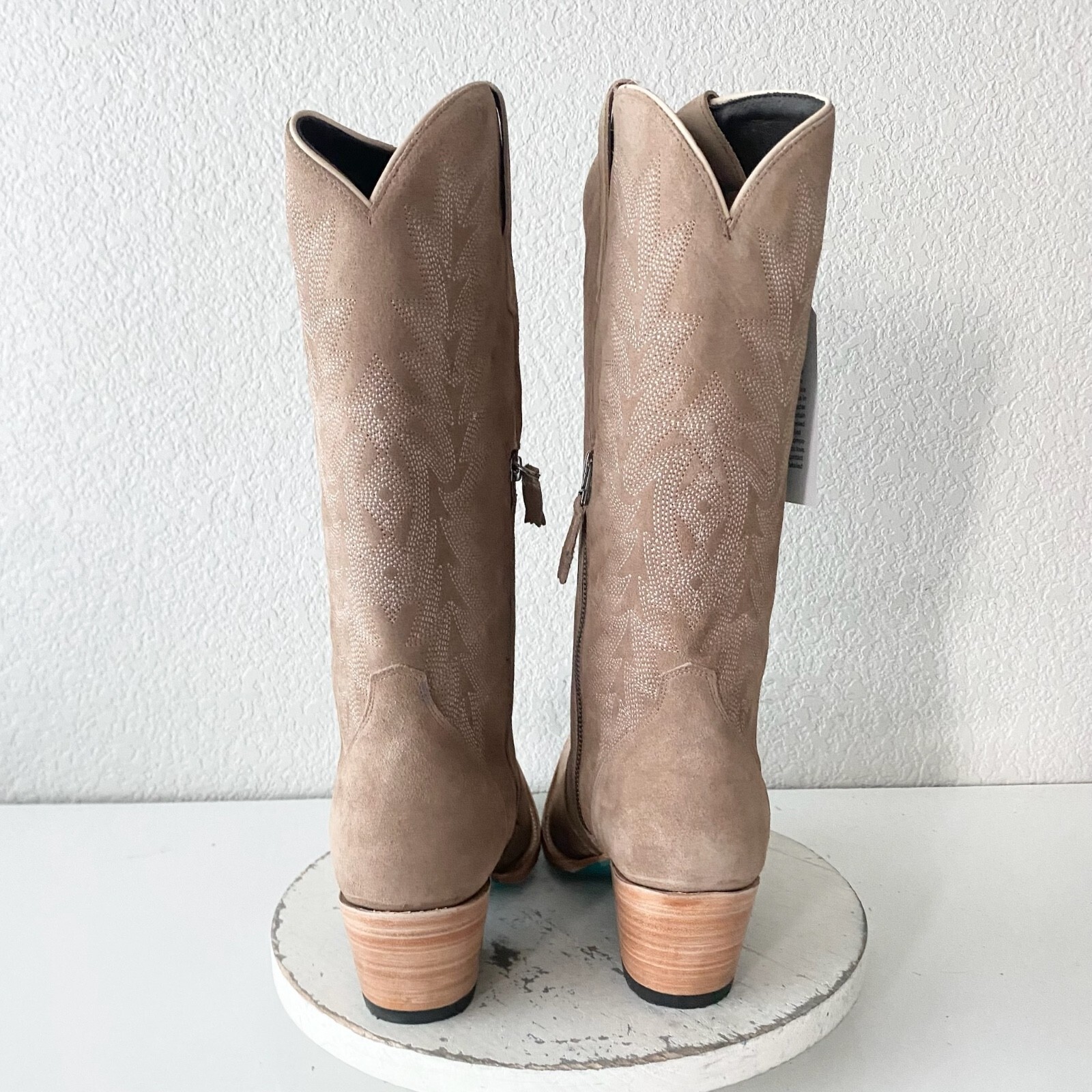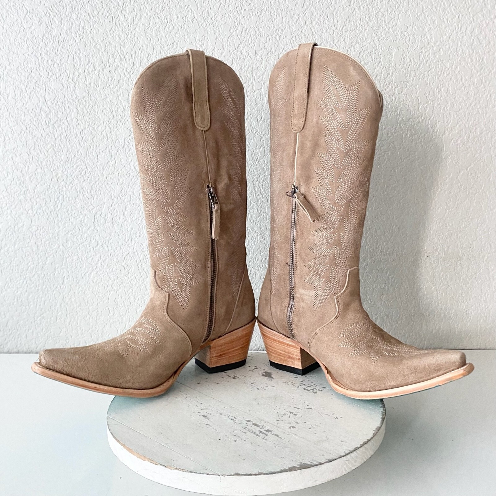 Lane GALLATIN Womens Cowboy Boots in Latte Suede Leather with a tall 16" shaft and Sculpted Round Toe