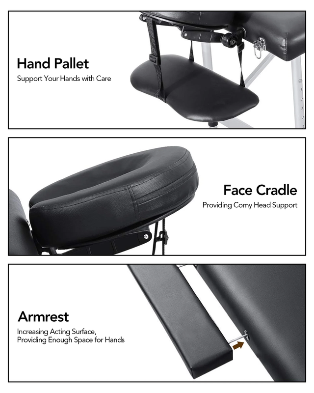 ? Professional Versatility Premium - The lash bed is suitable for the professional involved in beauty, salon, tattoo, reiki, healing, massage, therapy, etc. The surface of the massage table is covered with leather of waterproof and oil-proof, while the inner filling features high-duty foams of 2 inches thickness, soft and elastic. ? Space-Saving Foldable Design- With a foldable design and a security buckle, the massage table can be unfolded easily in the middle within 30 seconds, no tools needed. The portable massage table can be folded in half to a case with the handle when not in use, convenient for you to take to the office, home, or any place you want. After folding, the massage bed will become a carrying case. It can save space when not in use at home. ? Customizable Height Adjustment (24"-32.7")-The massage table has 9 levels of adjustable heights, ranging from 24 inches to 32.7 inches with easy adjustment, you only need to press the small round knob on the leg to complete the height adjustment. The massage table with 9 levels of adjustable heights is suitable for therapists of different heights, who provide customers with excellent service. ? Sturdy Yet Lightweight Frame- The support tubes of the massage table portable are made of aluminum to provide sturdy support, providing a more lightweight massage table. The bottom tubes and cord are made of aluminum, that the lash bed is even stressed and sturdy with a weight capacity up to 496 lbs. The legs are anti-slip, safe and suitable for all people. ? Detachable Accessories for Enhanced -The headrest and armrests of this massage table are detachable for your convenience, fixing with a bungee in case of losing. And the headrest can be adjusted up and down. The headrest of the massage bed is connected with a handle pallet underneath, ensuring you a more comfortable arm and head position.