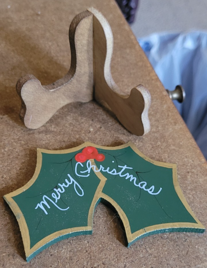 This wood Christmas tabletop decoration is in good used condition. There are no cracks in the wood that I found. The stand measures approximately 2.25 inches tall.