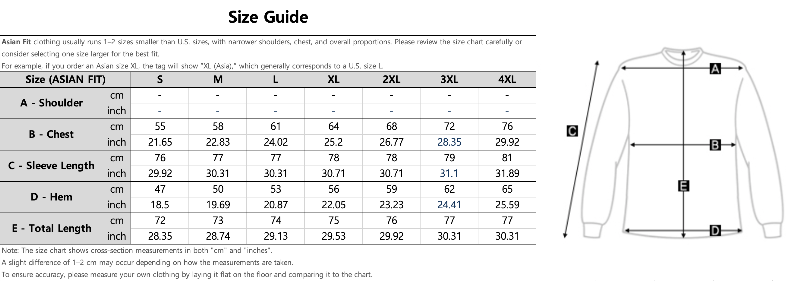 Asian Fit refers to clothing tailored for body shapes commonly found in Asian populations. These items typically run 1-2 sizes smaller than U.S. sizes, with narrower shoulders, chest, and overall proportions. Please check the size chart carefully or consider sizing up for the best fit.