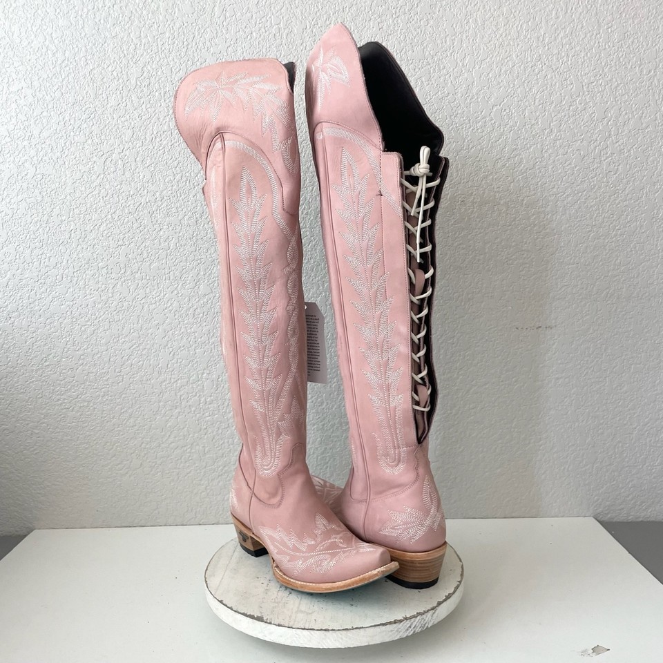 Lane LEXINGTON Over The Knee Womens Cowboy Boots in Blush Pink leather with a Western Snip Toe and Adjustable Corset that is Wide calf friendly.