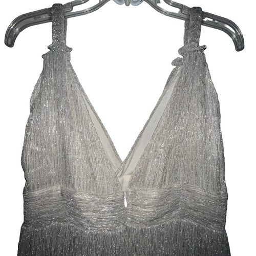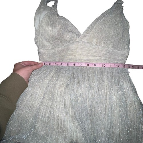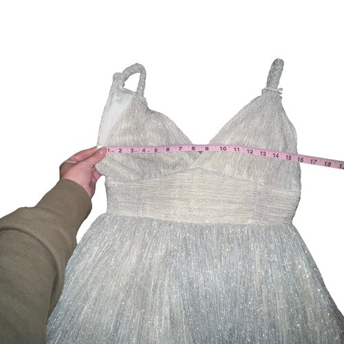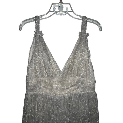 This dress is perfect for weddings, parties, and formal occasions. The dress is fully lined and comes with a zip closure for easy wear. The long dress length adds elegance and sophistication, while the accents of glitter give it a touch of glamour. Available in size medium, this dress is a must-have for any fashion-forward woman.