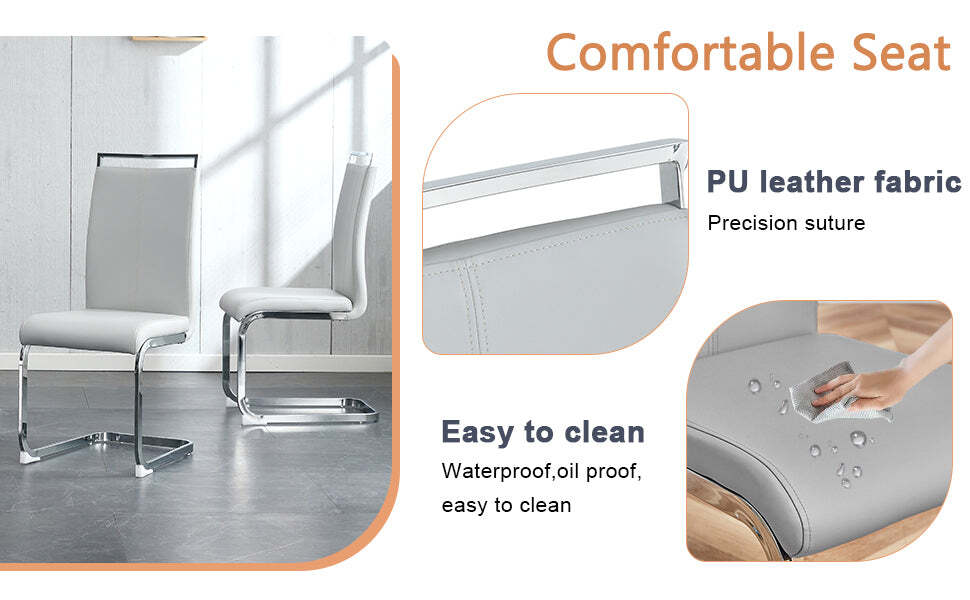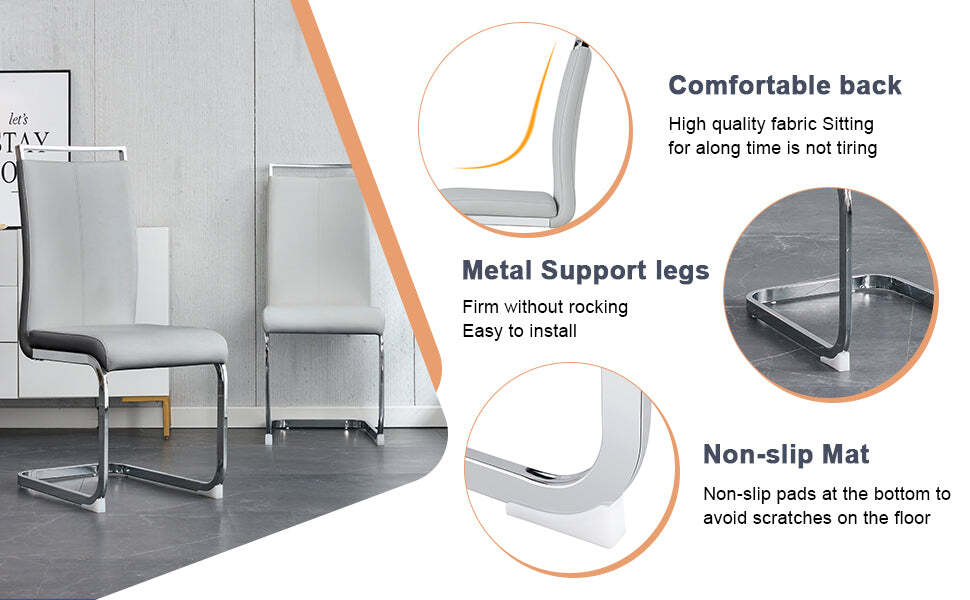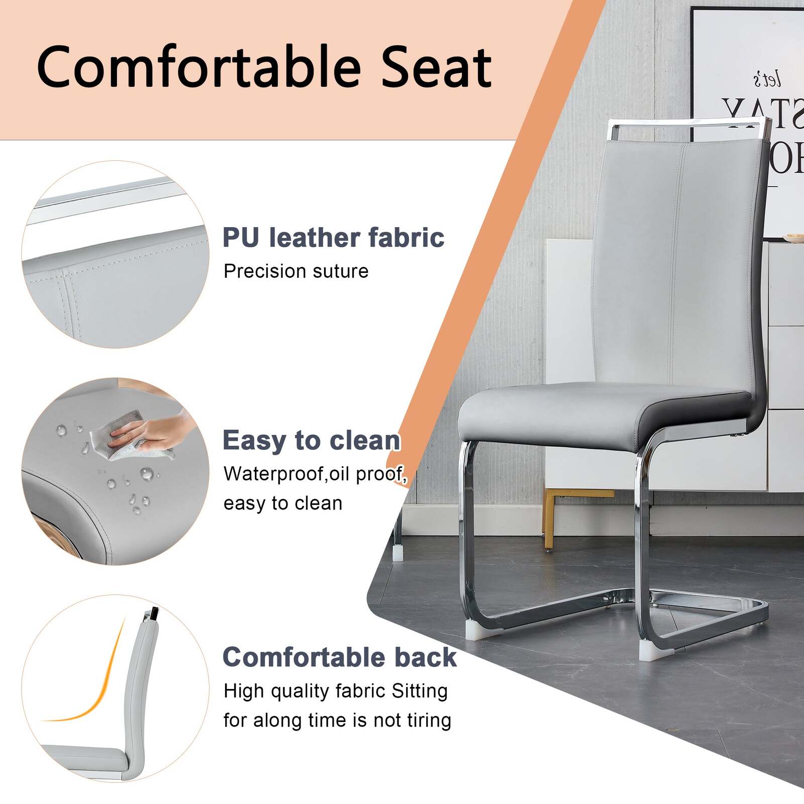 Simple Light Gray PU Chairs: The chairs feature a simple light gray PU material, harmonizing with the tabletop's marble pattern for a cohesive style.Comfortable Sponge Padding: The chairs are filled with sponge for a soft and comfortable sitting experience, with silver bow-shaped metal legs echoing the table leg design.