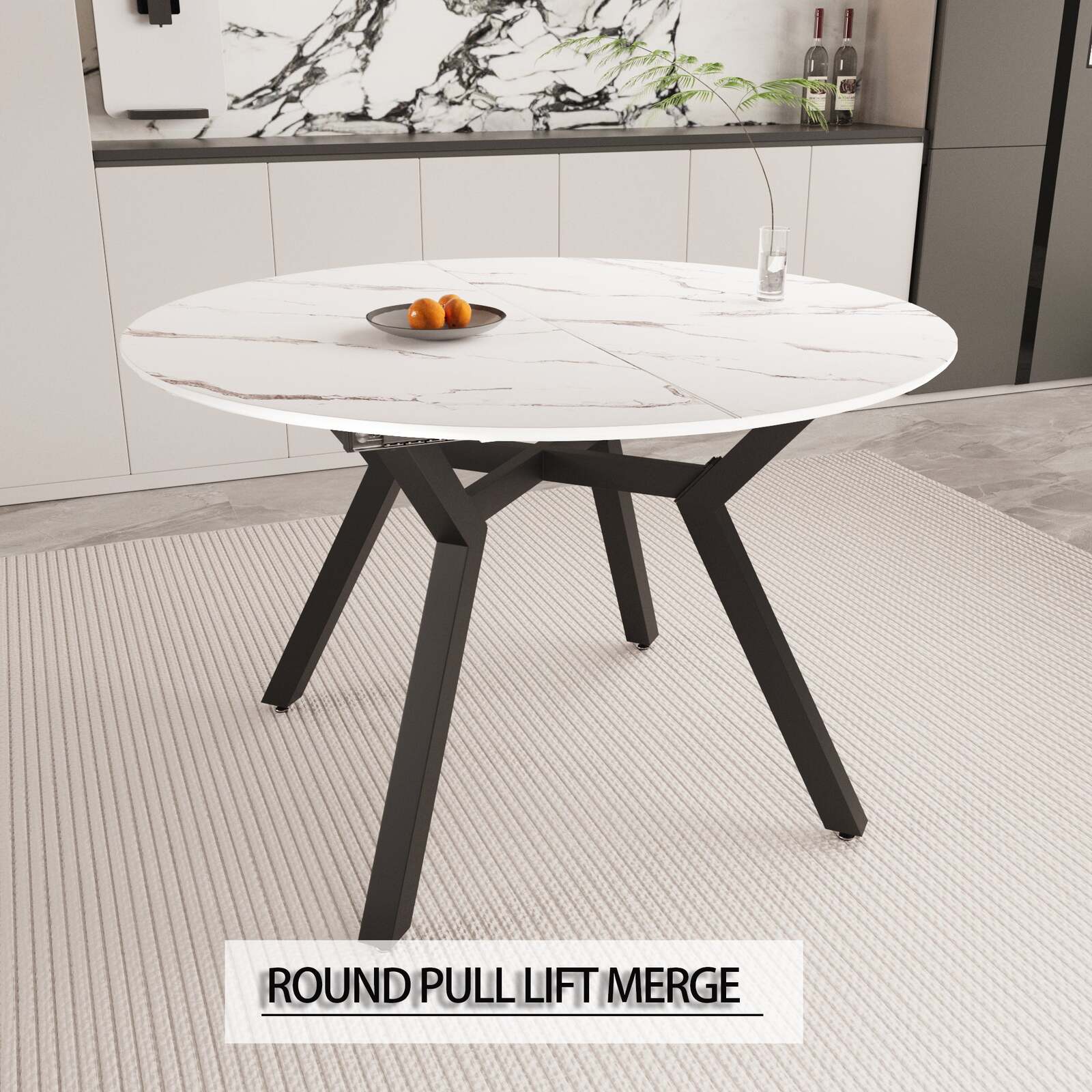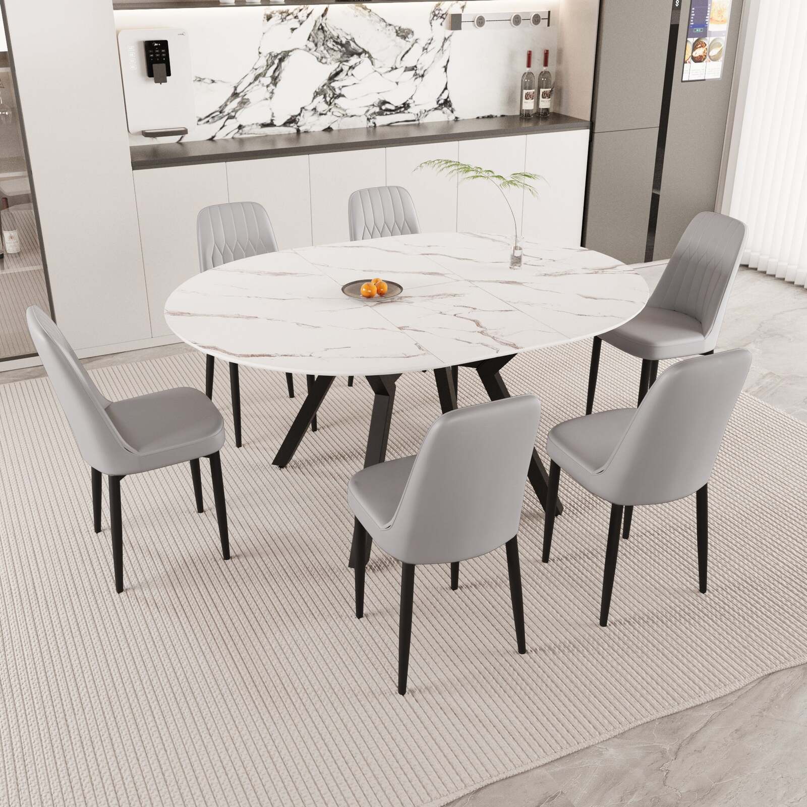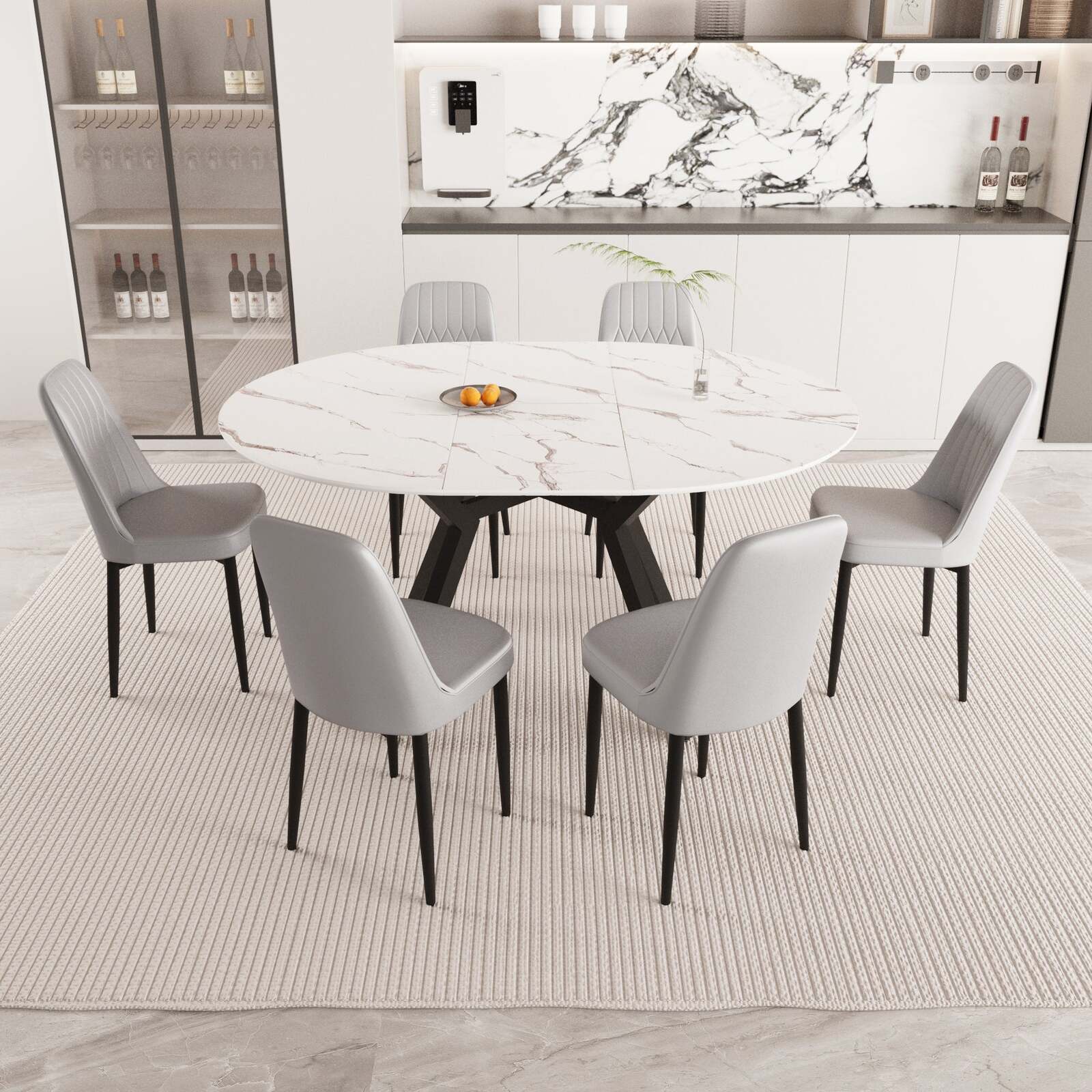 47-63" Expandable Round Dining Table Set, 6 PU Chairs, Black Metal Legs