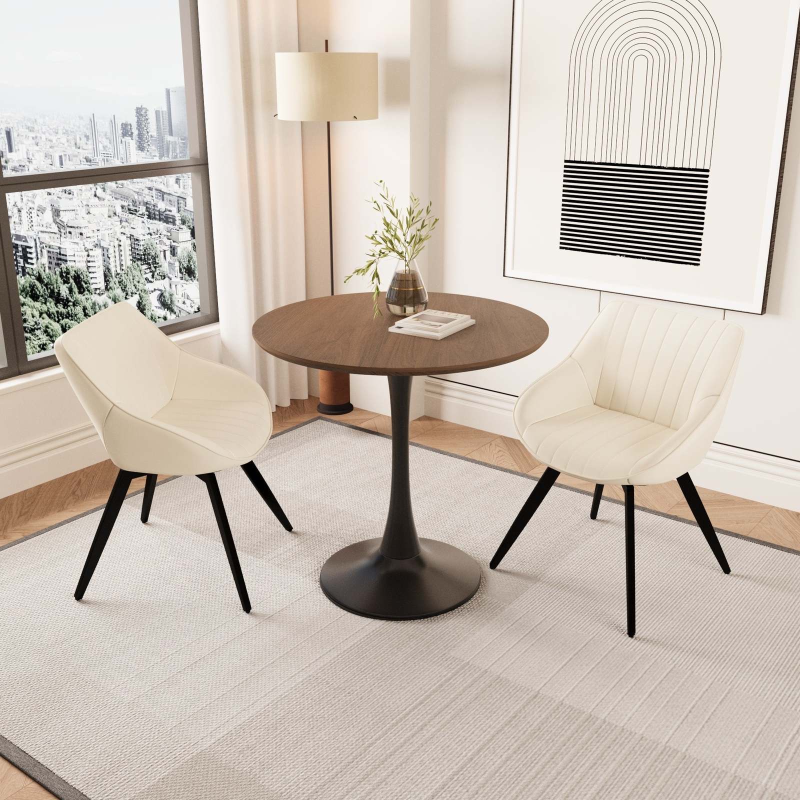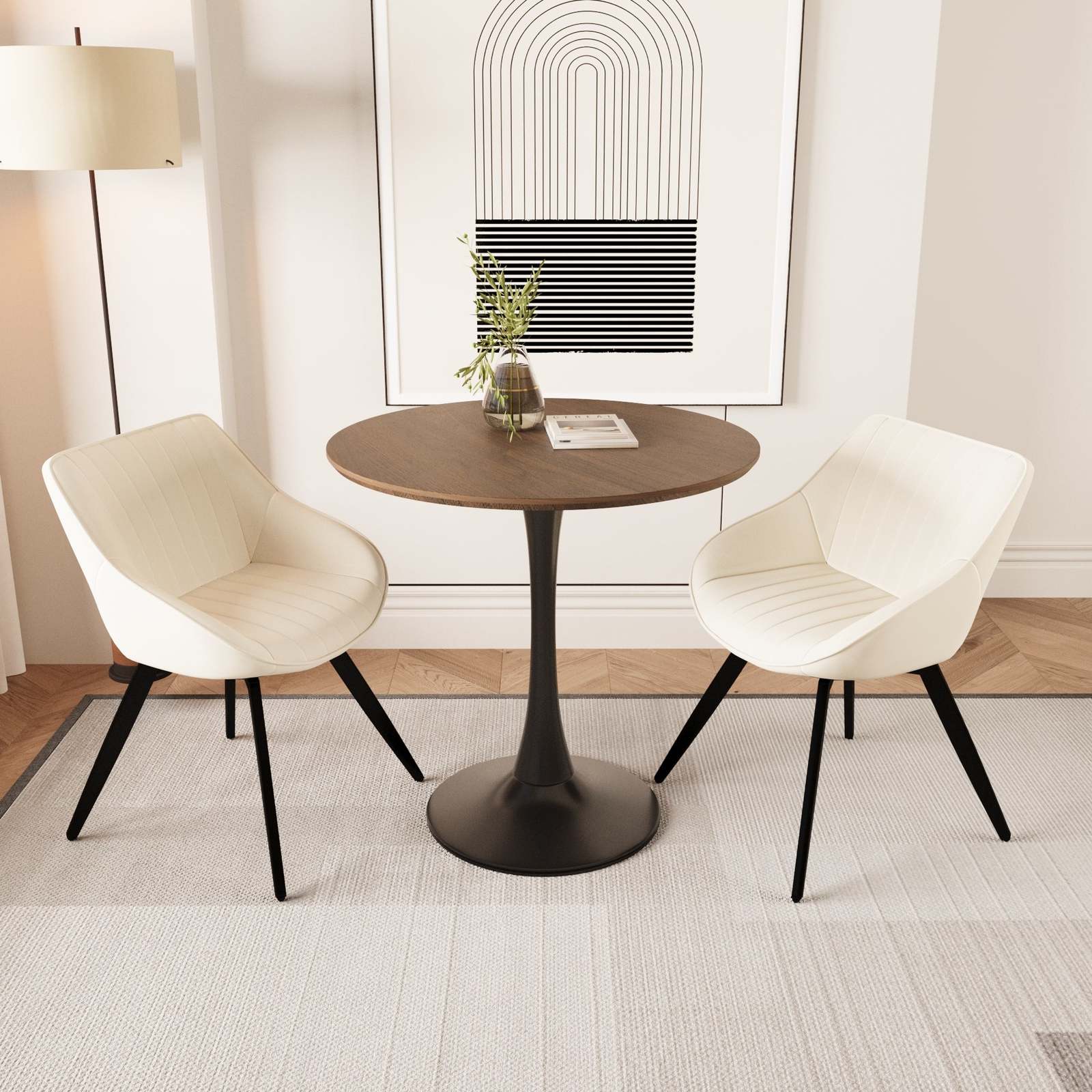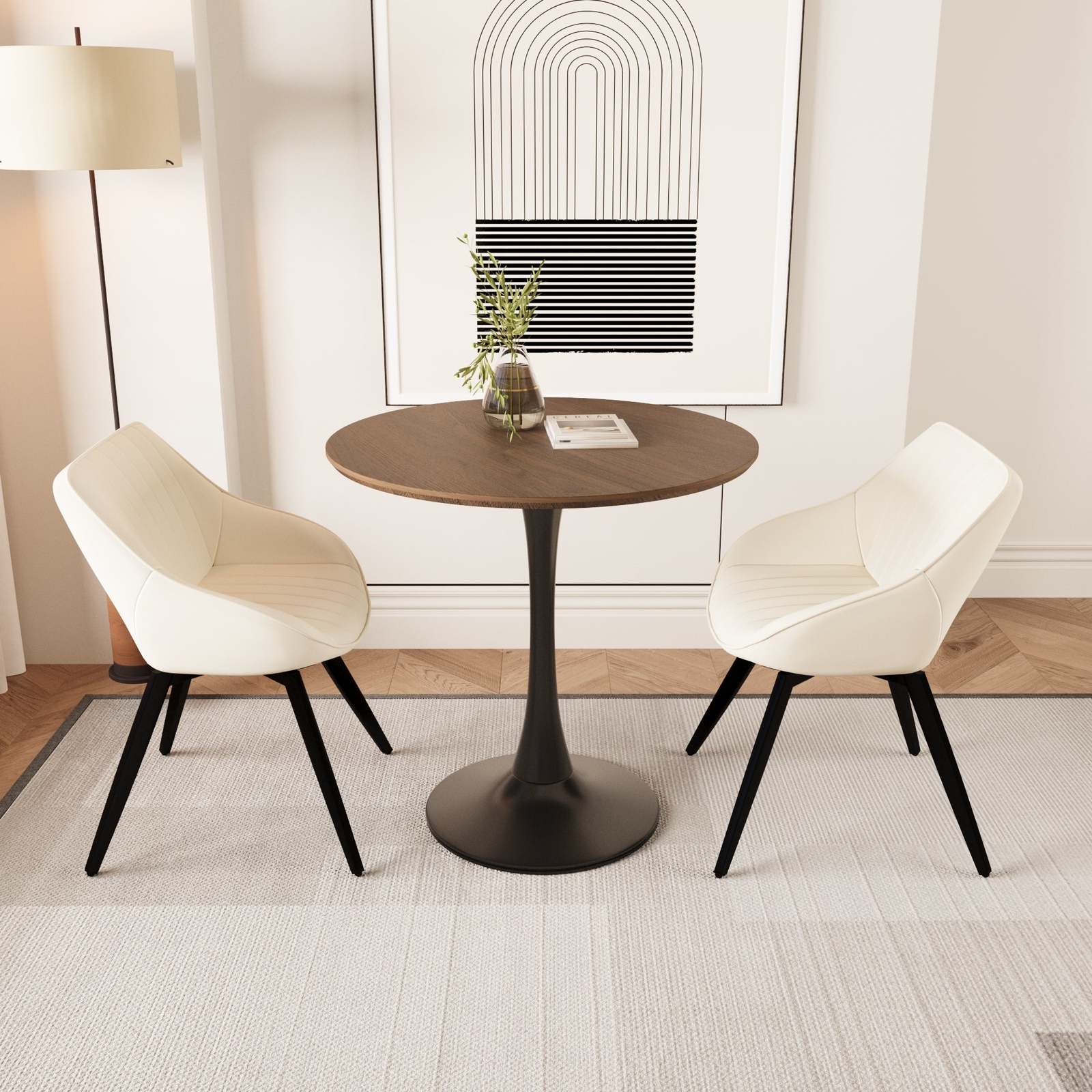 Walnut MDF Round Dining Table Set with Tulip Design & 2 Faux Leather Chairs