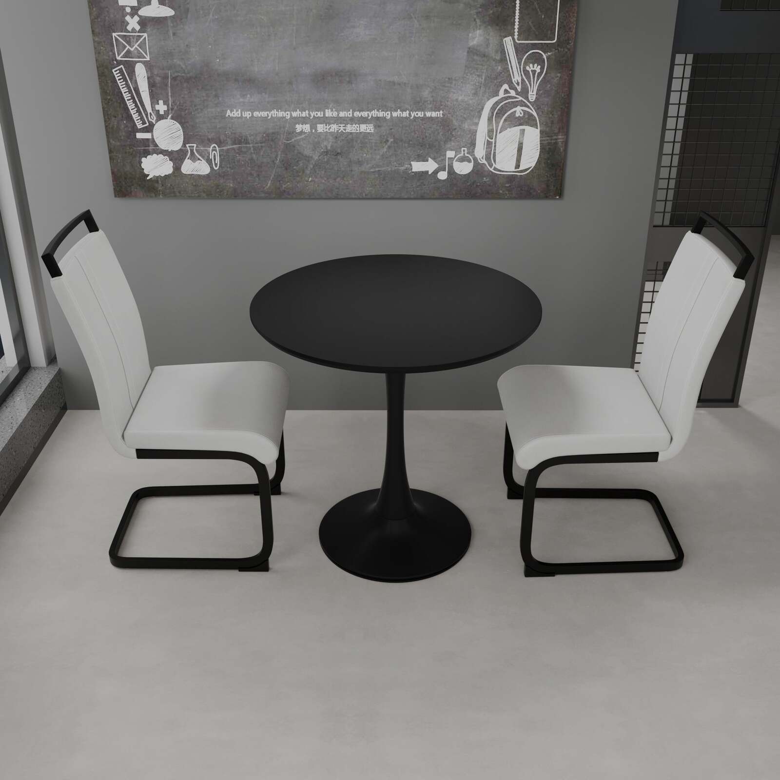 3.?round MDF dining table Set 2?Add a touch of sophistication to your home with this stylish tulip table featuring a timeless black finish and black metal Support and base