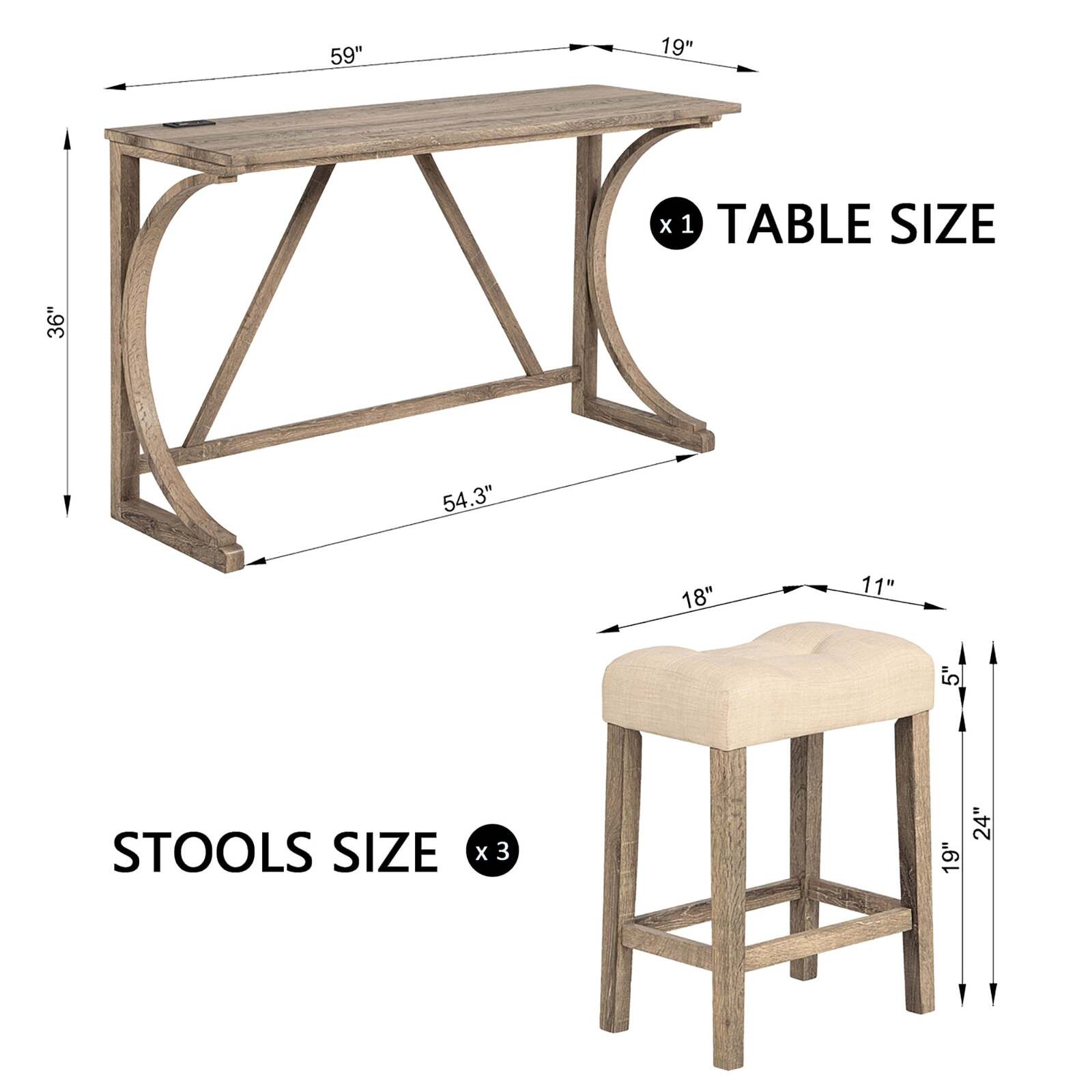 Dimensions and Assembly: Table size: 59' L x 19' W x 36' H. Bar stool size: 18' W x 11' D x 24' H. Weight capacity: The table weighs 250 lbs and the stool weighs 250 lbs. It comes with all the hardware and accessories you need, as well as detailed instructions and step-by-step instructions to guide you through the installation