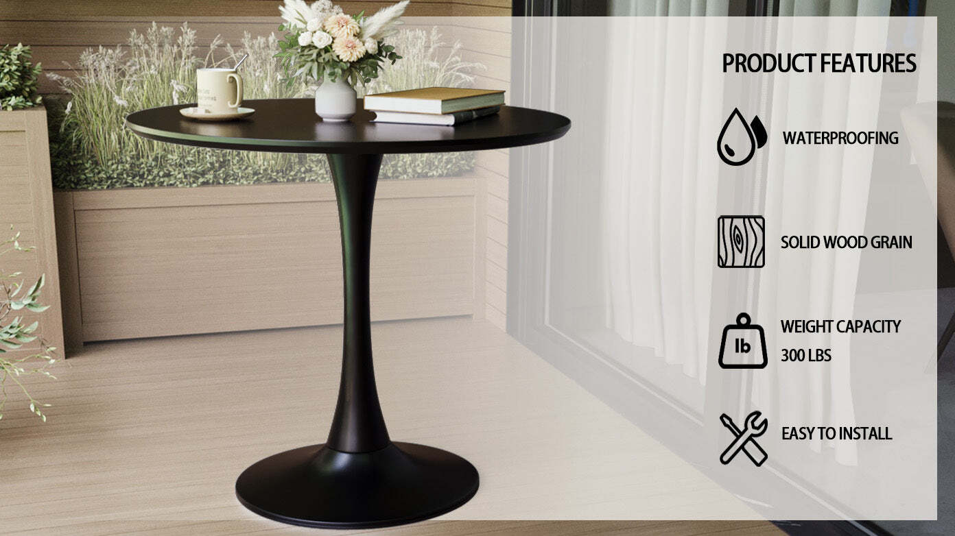 3.?round MDF dining table Set 2?Add a touch of sophistication to your home with this stylish tulip table featuring a timeless black finish and black metal Support and base