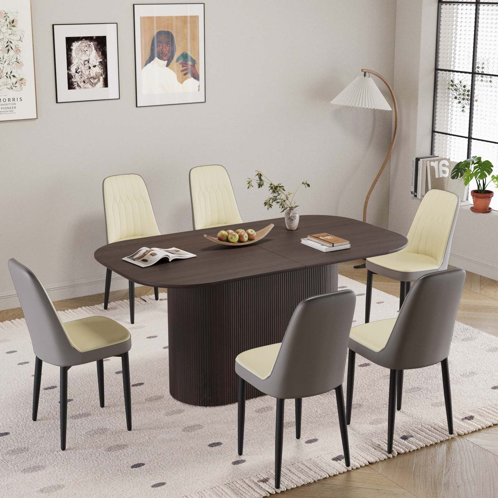 8.7 sets of tables and chairs: a table that can accommodate 4-8 guests for gatherings and 6 ergonomic artificial leather modern luxury style dining chairs, creating a fashionable focus for you in the dining area.