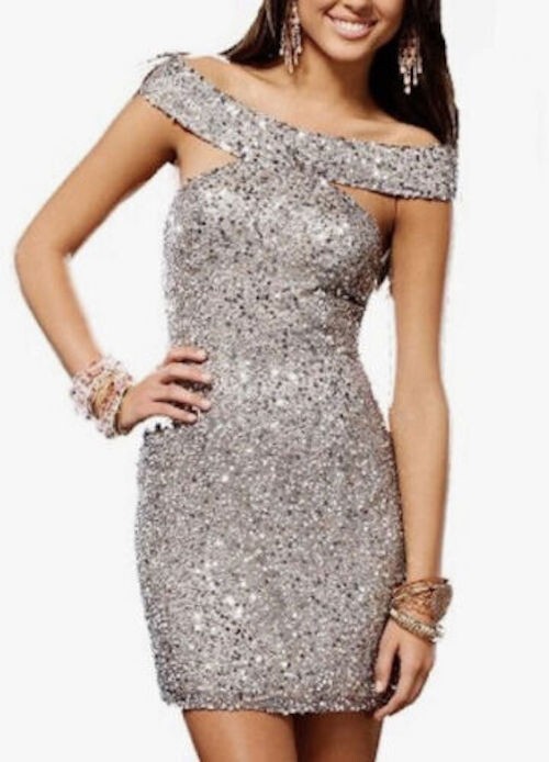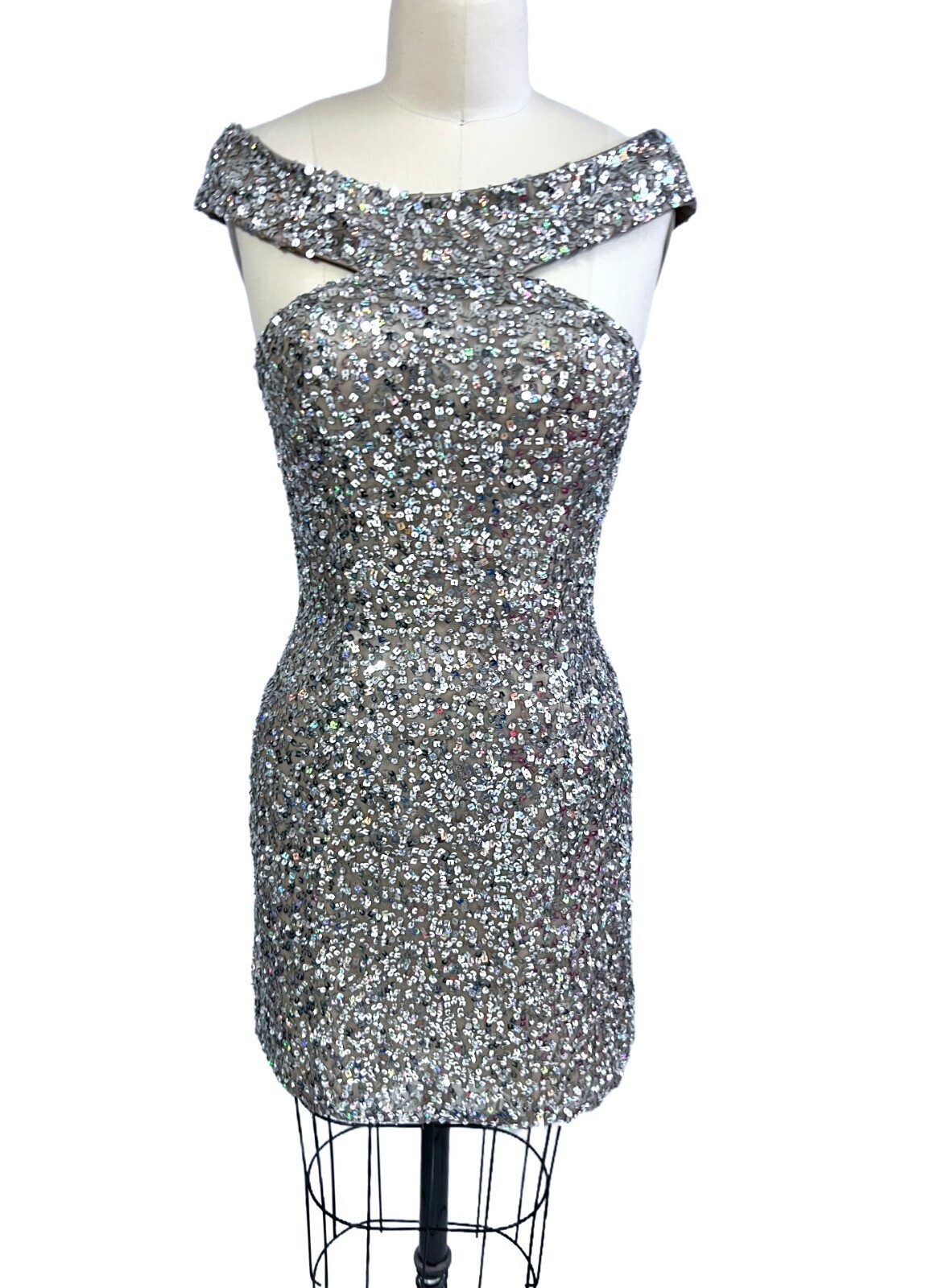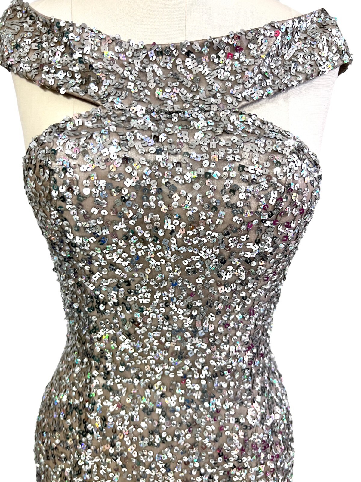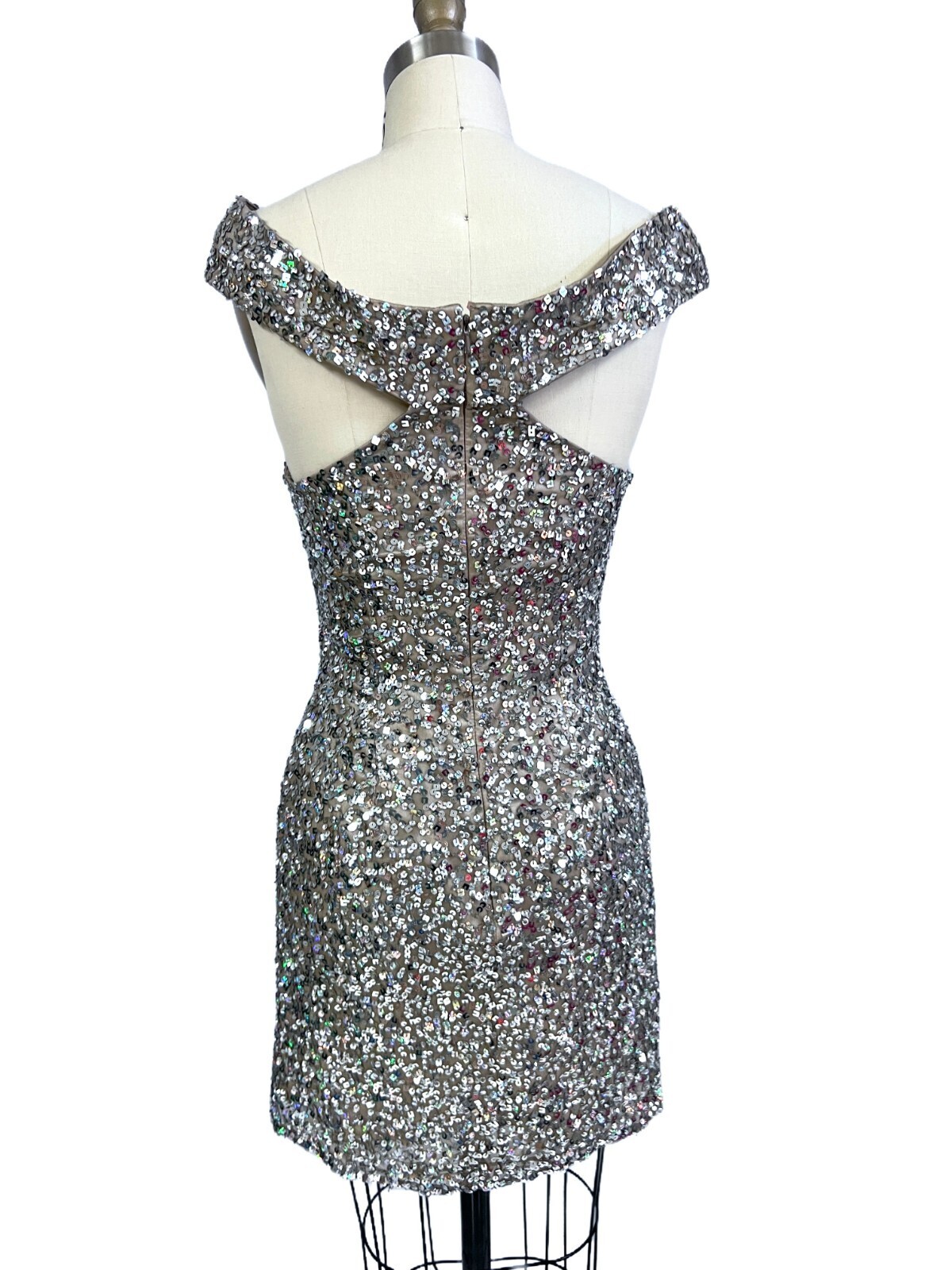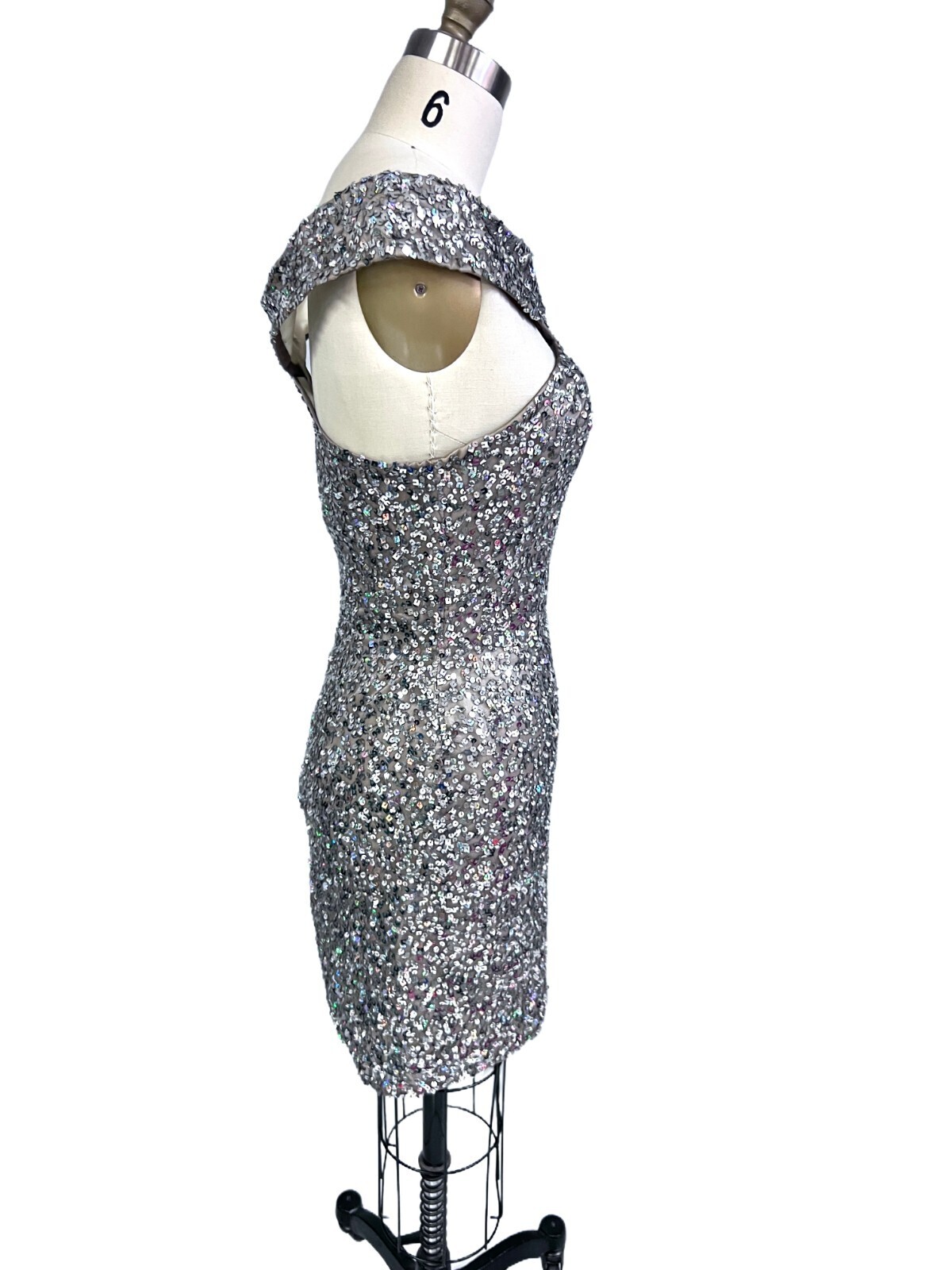 Scala 14185 Off Shoulder Silver Shiny Sequin Silk Cocktail Dress Women Size 6