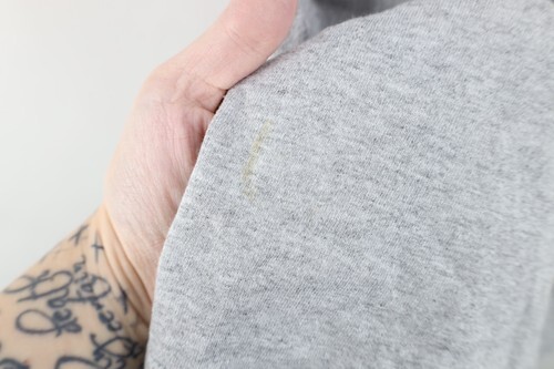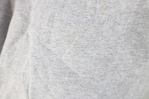 Stains front. Dark spots, pilling. Collar, arms discolored. Graphics, color faded