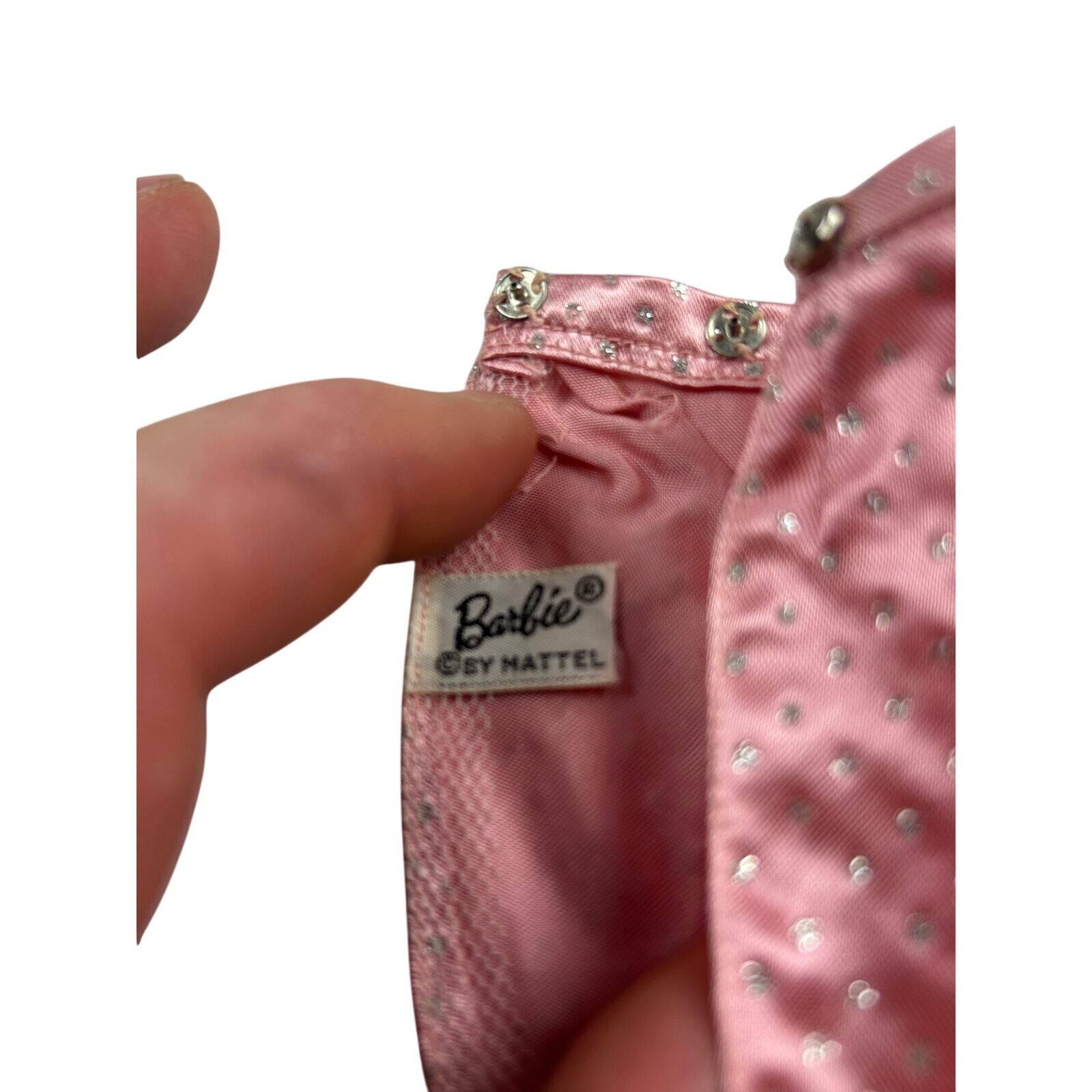 Authentic 1963 Barbie Fashion Pak wrap skirt, crafted in pink satin with silver glitter polka dots. Features the original "Barbie by Mattel" tag and factory snaps at the waistband. This piece was released as part of Mattel?s mix-and-match Fashion Pak line?not part of a numbered outfit. Excellent vintage condition with the glitter still vibrant and snaps intact.