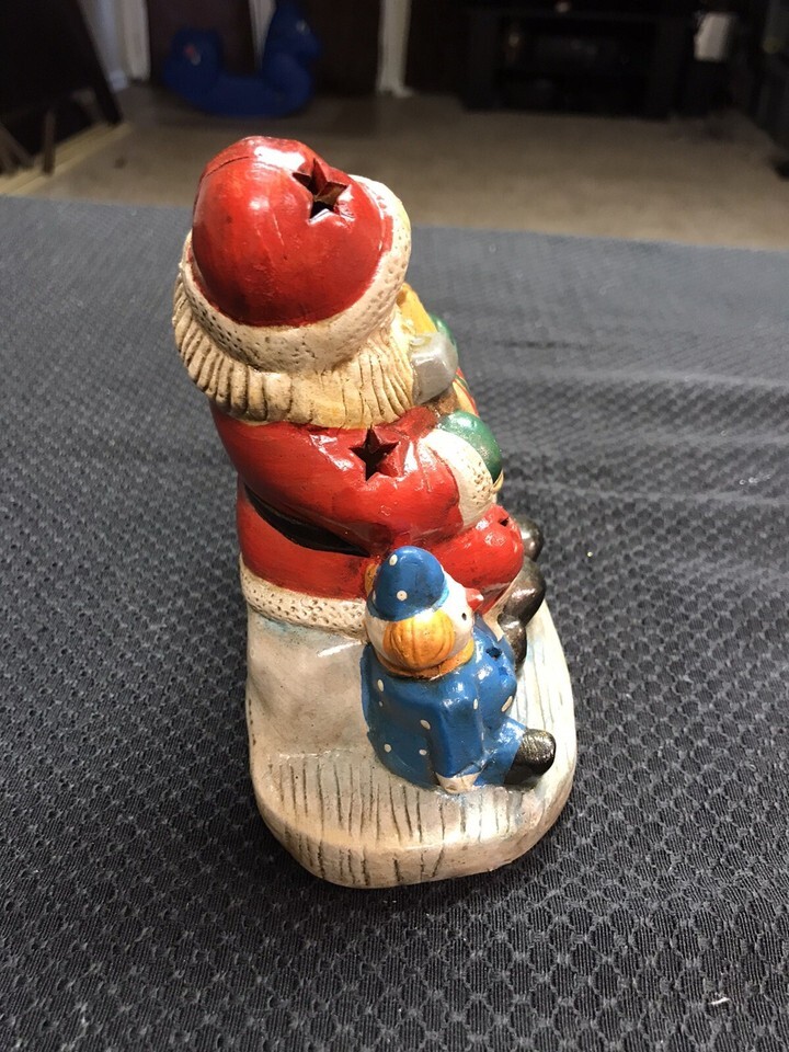 Vintage Terra Cotta Hand Painted Santa Tea Candle Holder Christmas Holiday Light