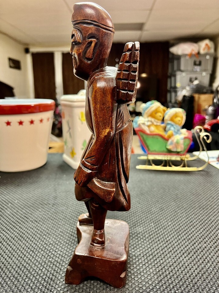 Antique Oriental Asian Hand Carved Wooden Man Carrying Stacked Wood On Backpack.