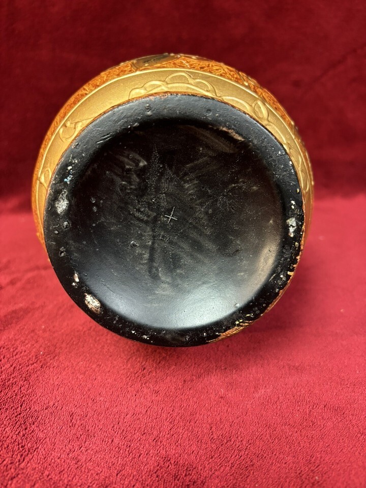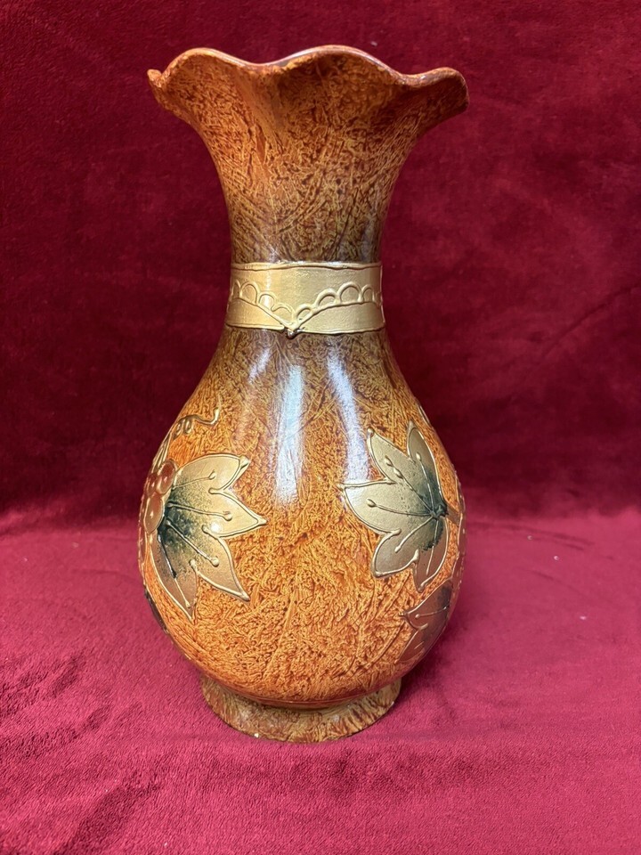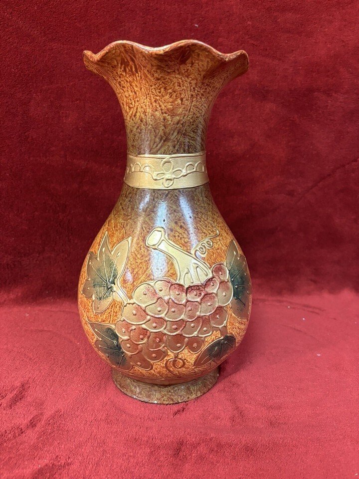 Gorgeous Vintage Orange Red Ceramic Vase With Grape Design & Gold Trim