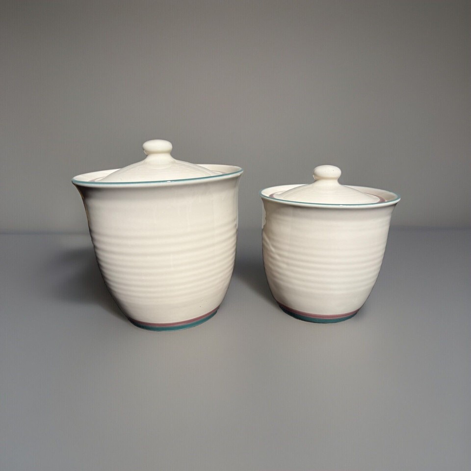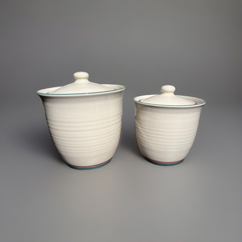 This vintage set of 2 Pfaltzgraff bean pots in cream color is made of ceramic, perfect for storing cookies, candies, or other kitchen essentials. With a charming appeal, these bean pots are both decorative and functional, adding a touch of nostalgia to your kitchen decor. The Pfaltzgraff brand ensures quality and durability, making these containers a timeless addition to your home.