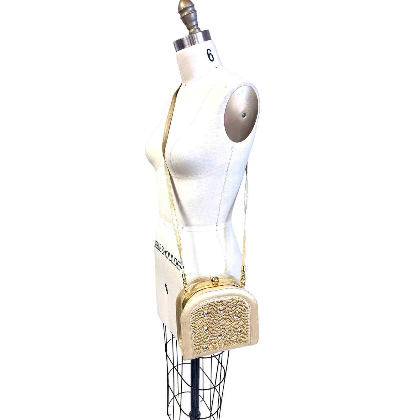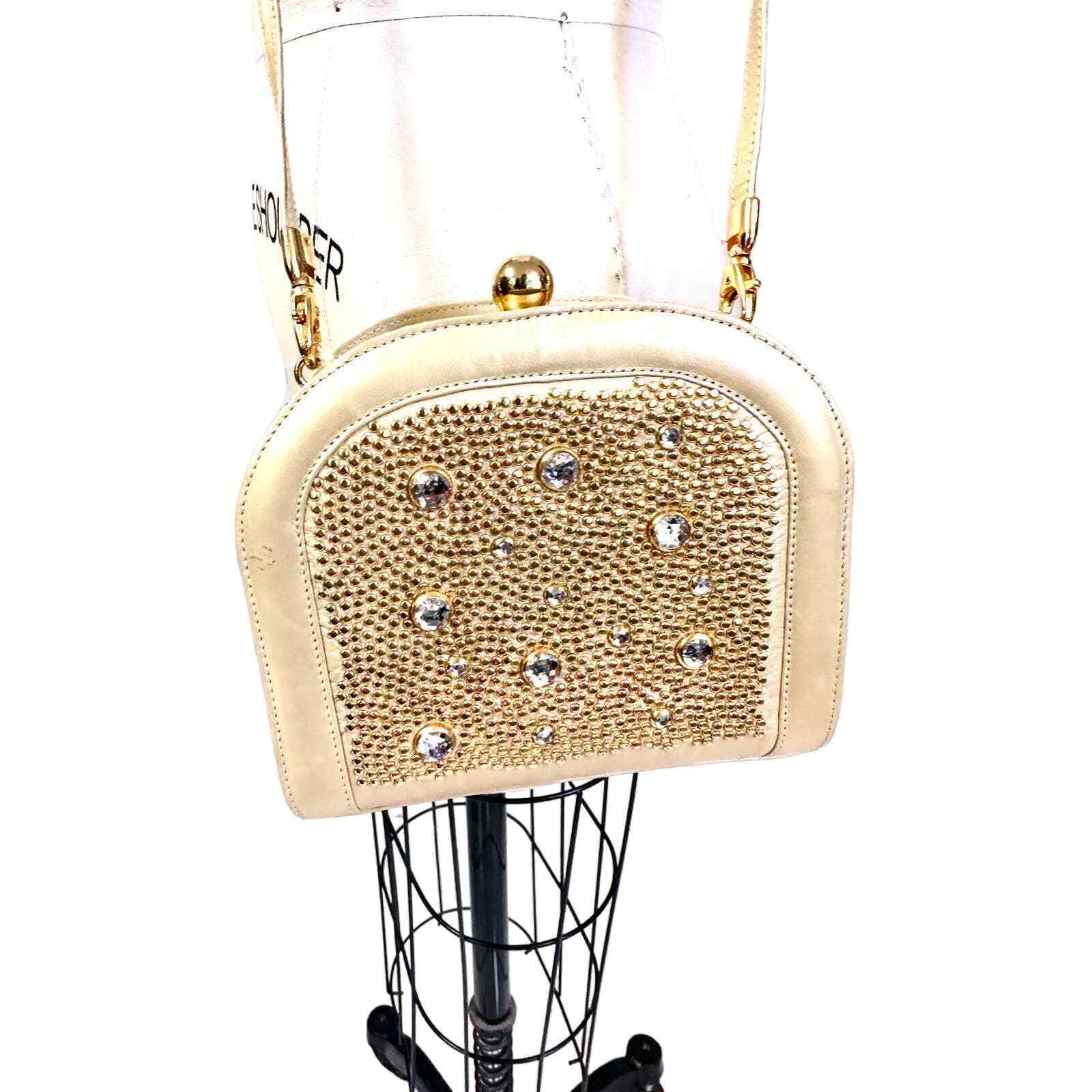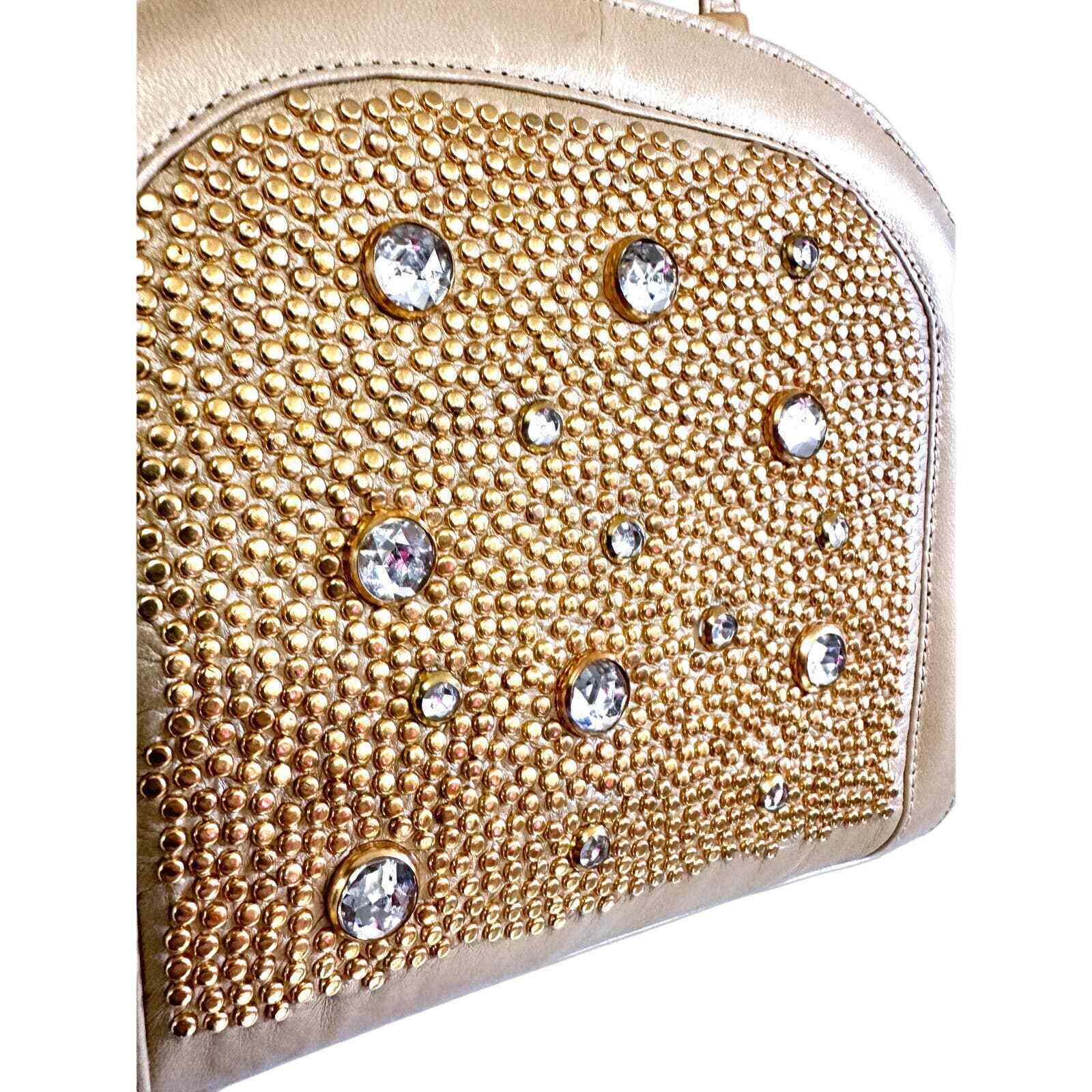 Vintage STUART WEITZMAN, Made in Spain. Hard body purse. Gold flat head beads Rhinestones on front and large gold bead snap clasp. MORDORE LEATHER. Has tags from the 80s, as you can see, an expensive bag!Has its original dustbag as well. New condition.
