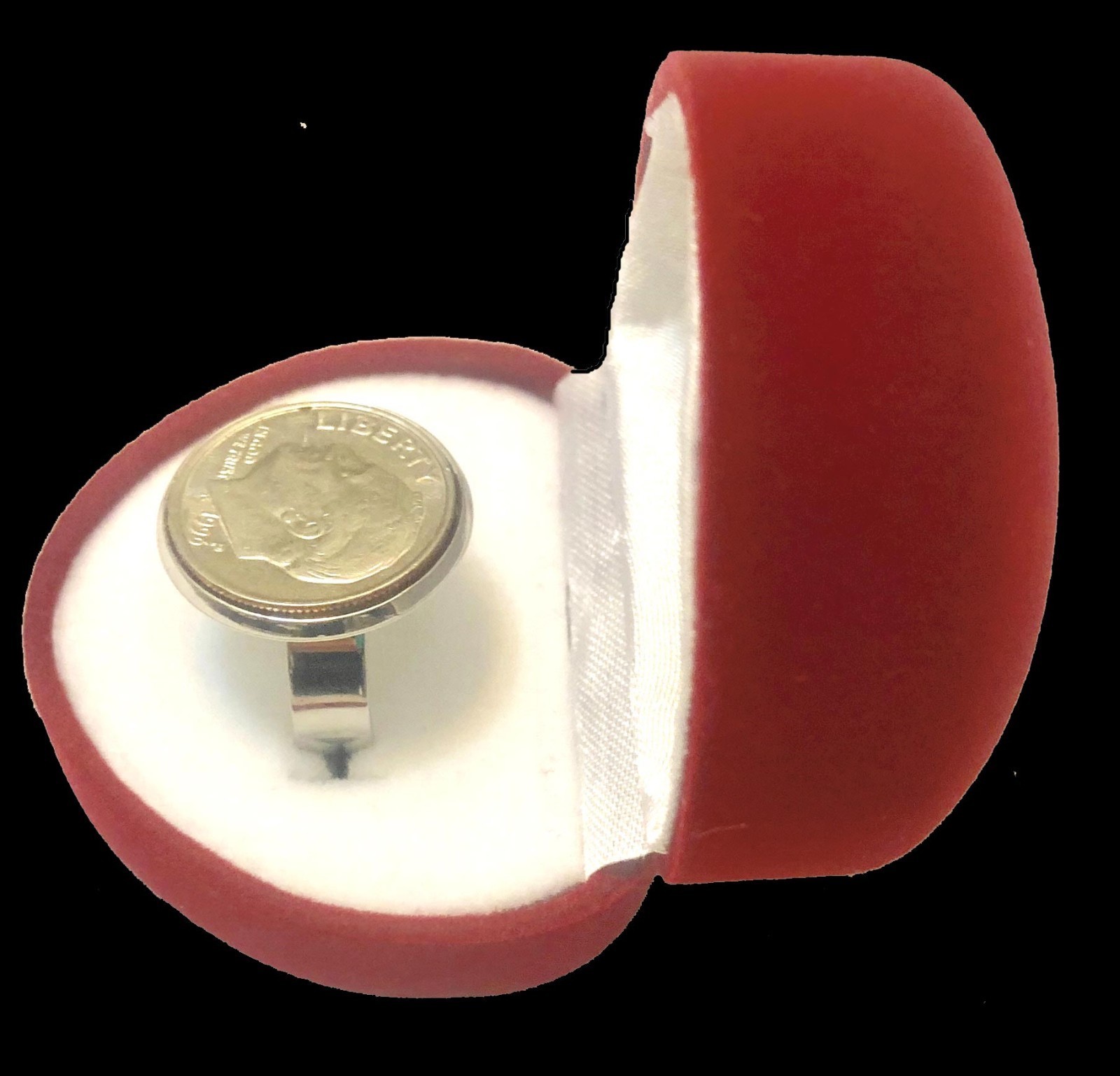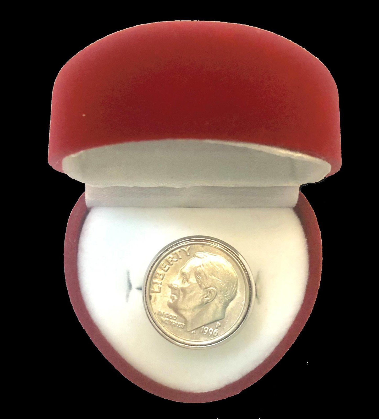 A real U.S. dime set into a ring. Complete with a beautiful RED VELVET COVERED HEART SHAPED RING BOX! It?s a DIME-ON RING, not ??Diamond?? like she hoped for.