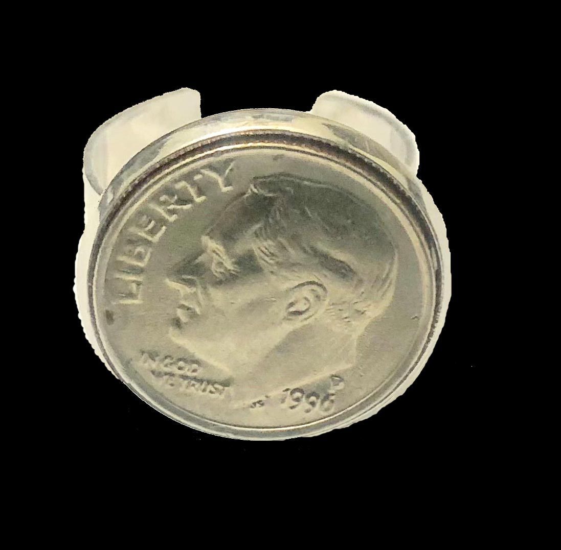 Featuring a real genuine circulated US dime, with assorted date year, on an *adjustable silver-tone metal ring base. *Adjustable size fits a range of average finger sizes.