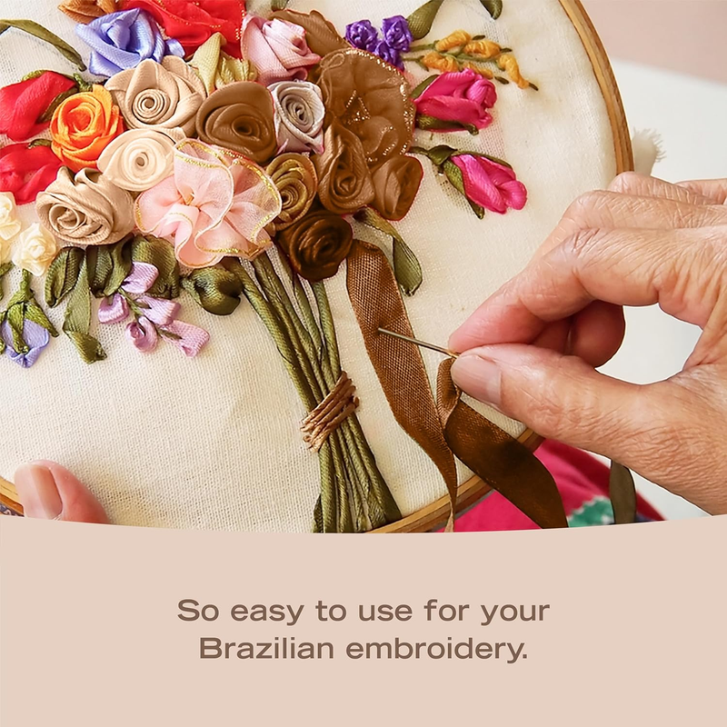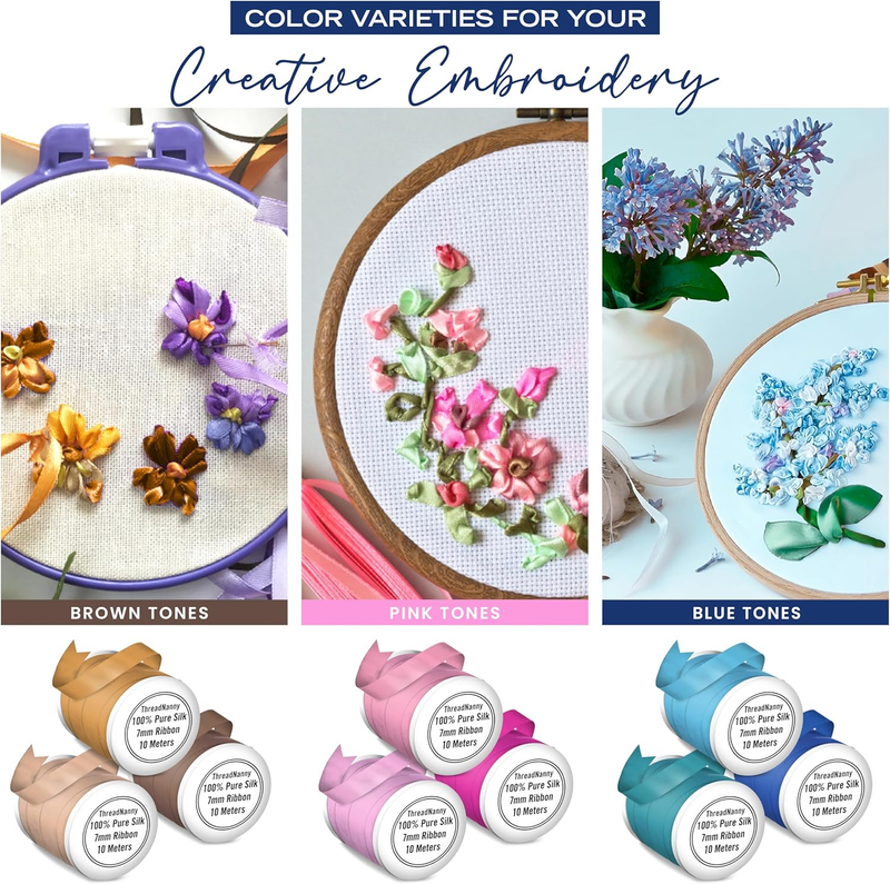 6 spools of 100% Pure Silk Ribbons of 7mm size. Each spool has 10 meters of ribbon on it giving you a total of 60 meters (approximately 66 yards). This set includes 6 different shades of Brown - No Duplicates. This is Best Quality Silk Ribbons and have a retail value of approximately $9.00 per spool, . The Ribbons come prewound on their individual plastic container for easy storage. These Embroidery Ribbons have a beautiful sheen on them as seen in the pictures and will make your project stand out.