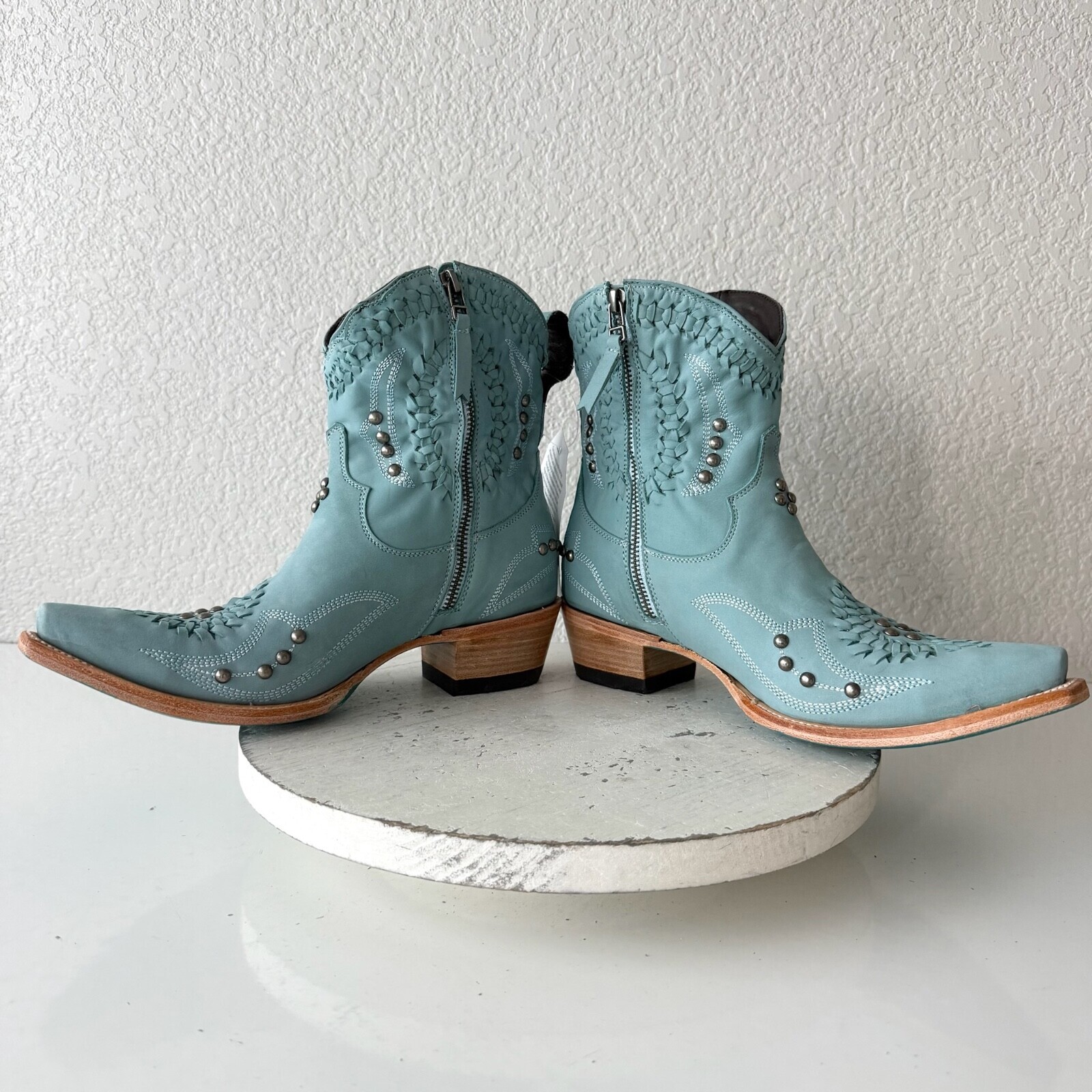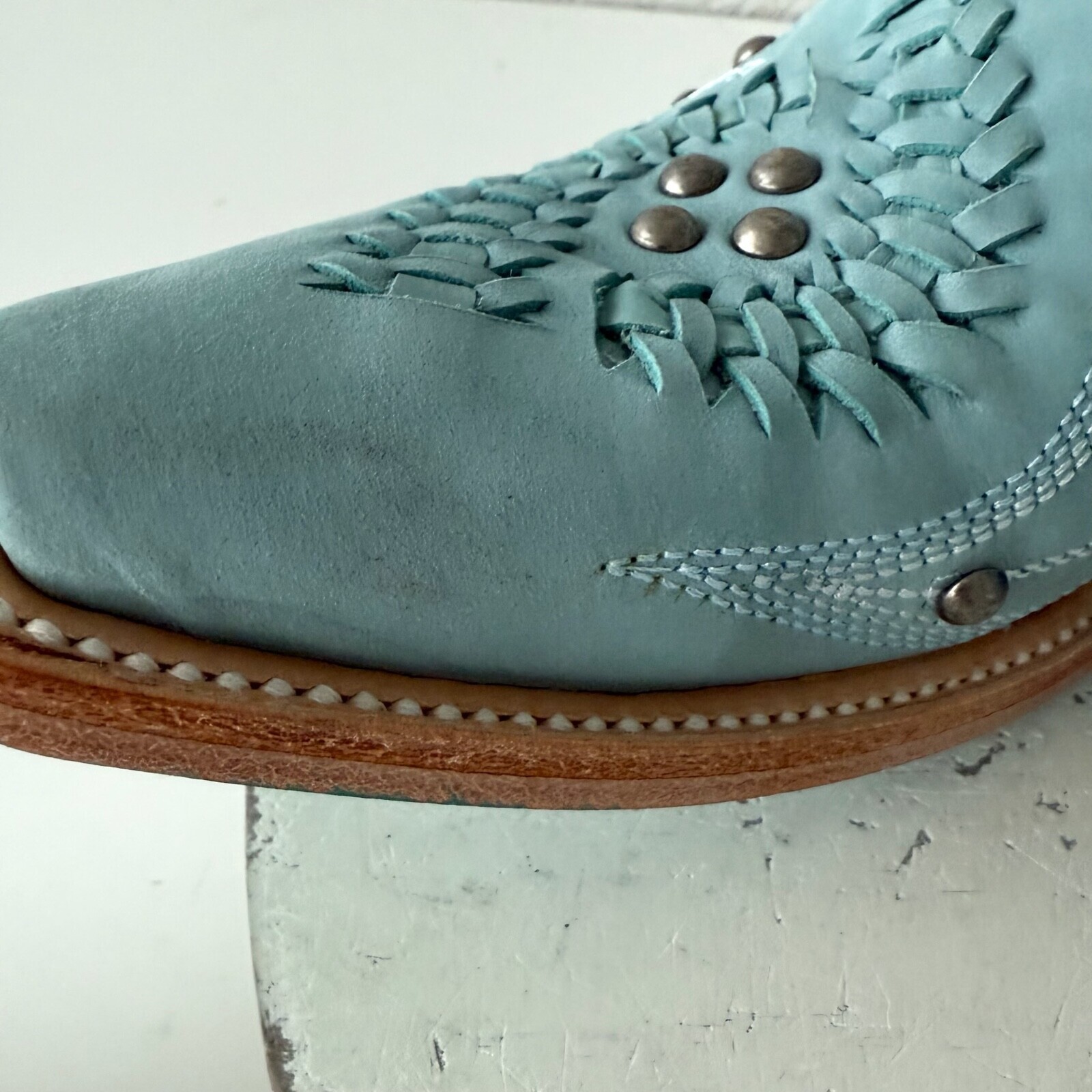 Lane COSSETTE Womens Cowboy Booties in Powder Blue Leather with Silver Studs, Detailed Leatherwork, and a Western Snip Toe