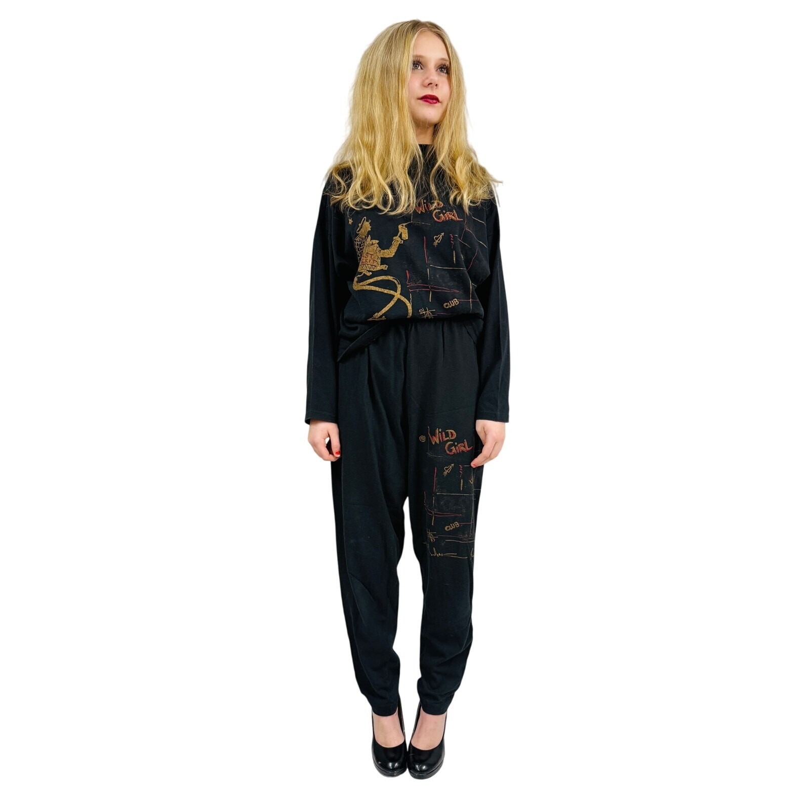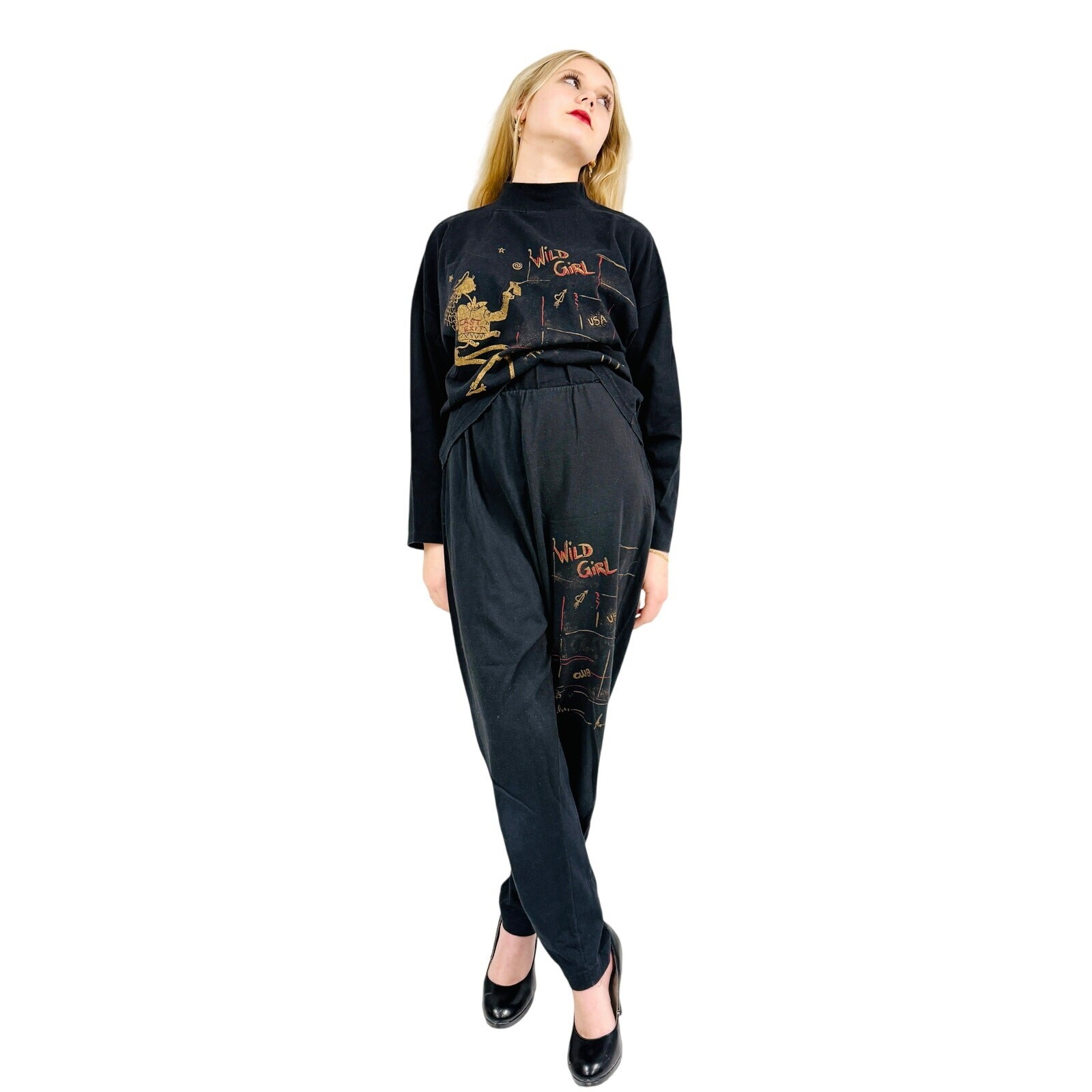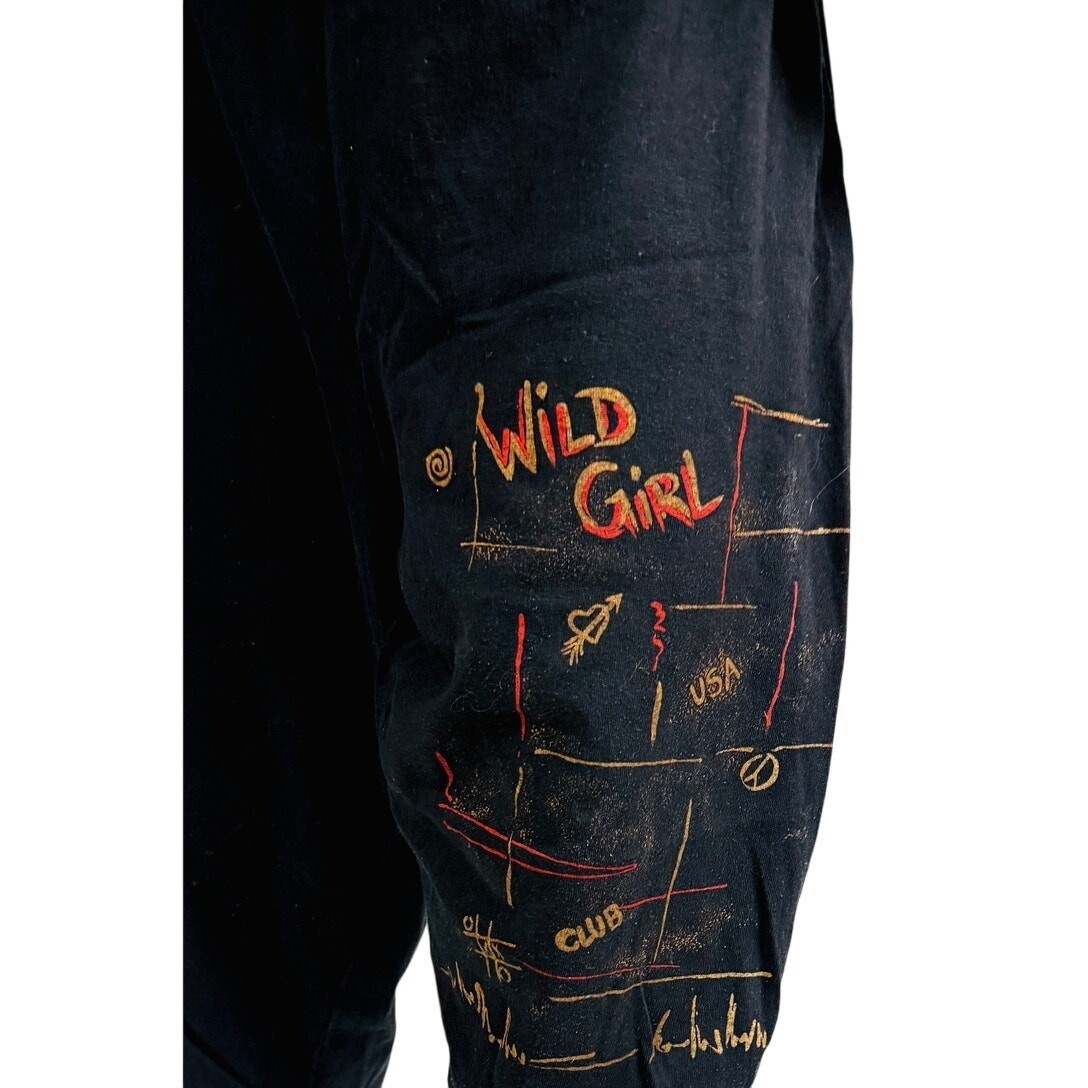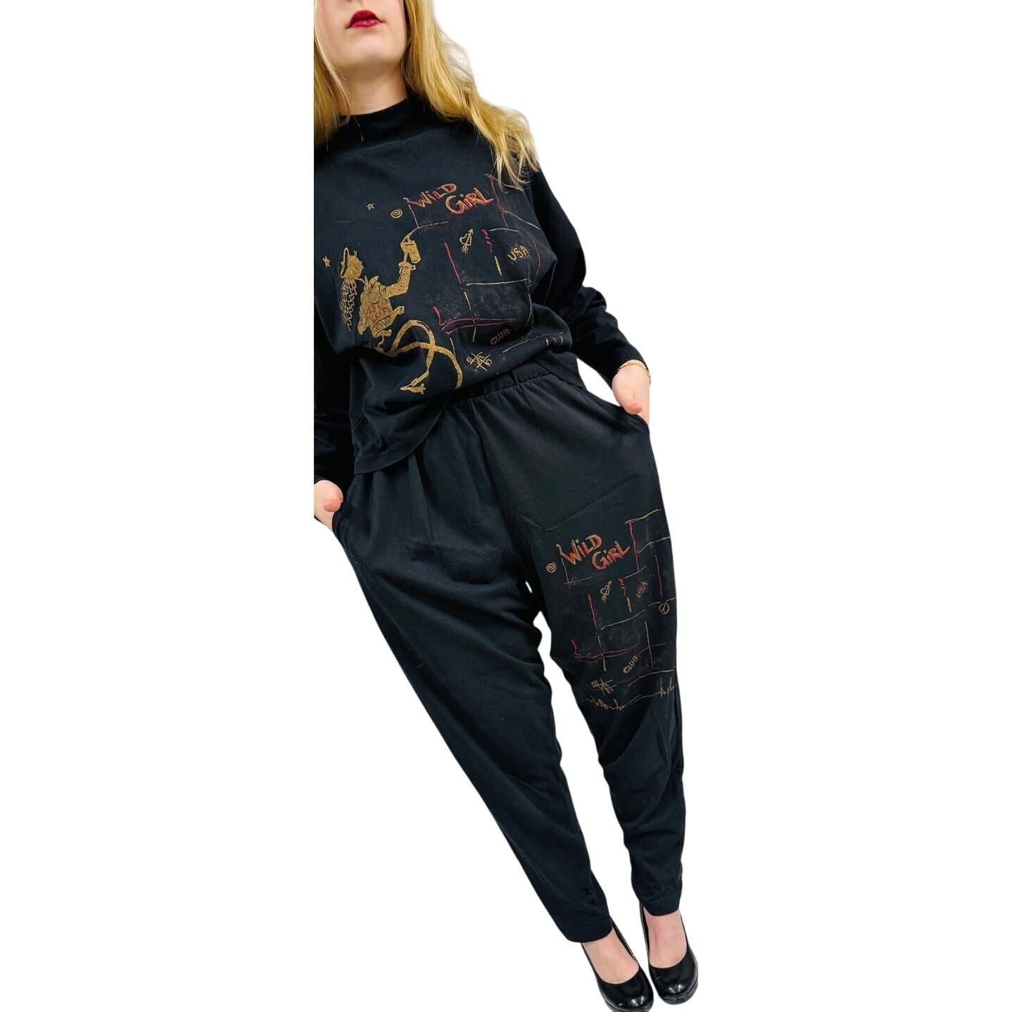 Vtg 70s Wild Girl Graphic Black Sweat Shirt + High Waist Pant Set 100% Cotton S