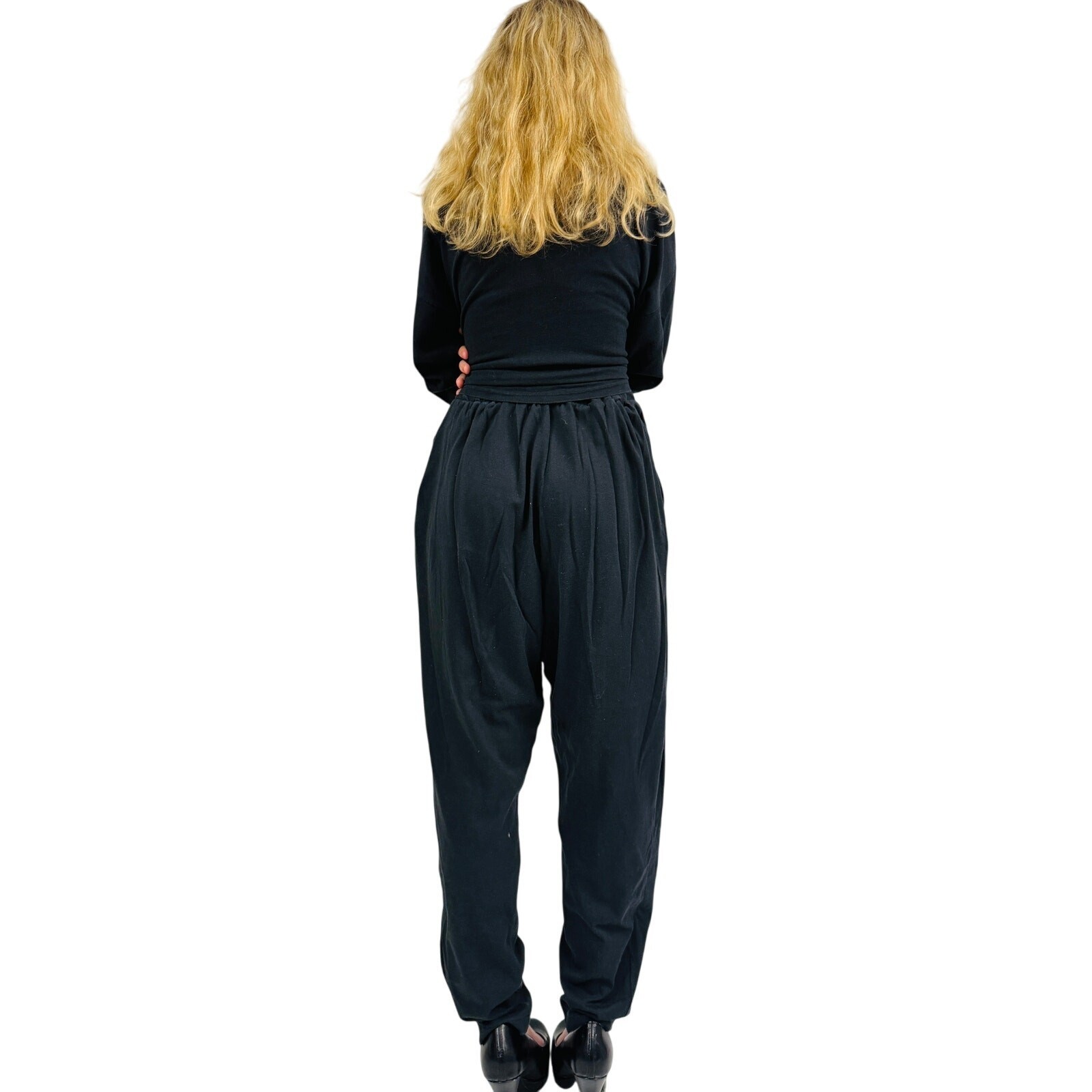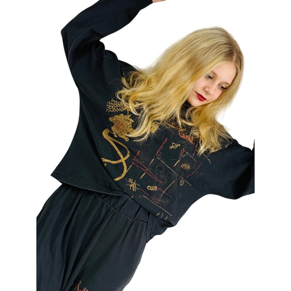 Check out this amazing vintage 1970s wild girl graphic black long-sleeved Sweat shirt and high-waist pant set, made of 100% cotton in size small! It's definitely a one-of-a-kind find- I've never seen anything like it! The top features a super cool graphic, complete with the words "Wild Girl" and some fun cartoon characters that really make it pop. The pants are designed for comfort with a pull-on style, an elastic waistband, and stylish tapered legs, plus they come with pockets! Everything is in great, clean condition, ready for you to stand out from the crowd! No labels.